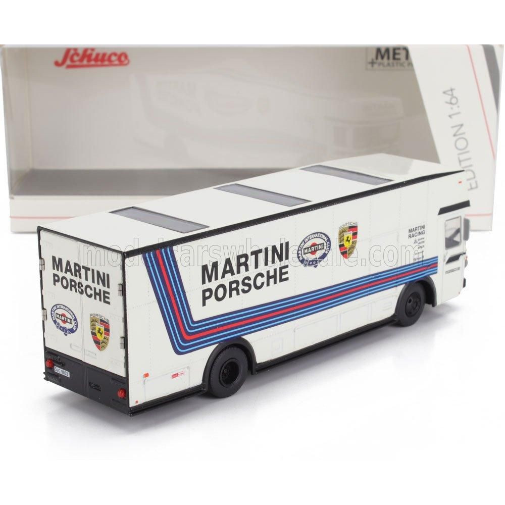 SCHUCO MERCEDES BENZ O317 TEHERAUTÓ AUTÓSZÁLLÍTÓ PORSCHE MARTINI RACING 1968 - FEHÉR KÉK 1/64