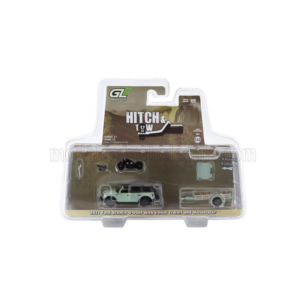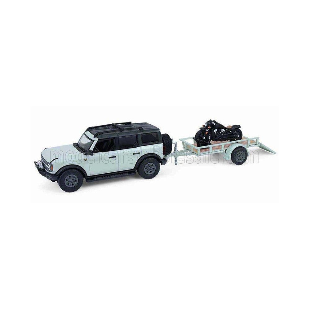 GREENLIGHT FORD USA BRONCO FEKETE GYÉMÁNT PÓTKOCSINÁL + MOTORKERÉKPÁR 2021 - VILÁGOSZÖLD FEKETE 1/64