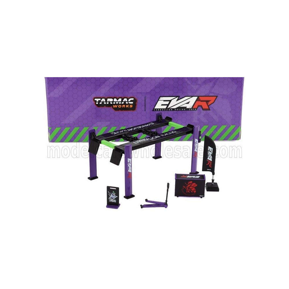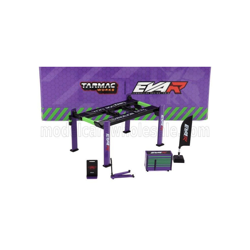 TARMAC KIEGÉSZÍTŐK EVA VERSENYGARÁZS KÉSZLET OFFICINA - PONTE SOLLEVATORE AUTO - NÉGY OSZTÁS EMELŐ - LILA FEKETE ZÖLD 1/64