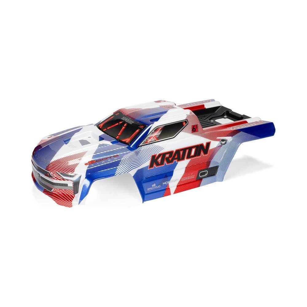 Alkatrész Arrma 1:8 Kraton 6S BLX V6 RC autómodellekhez: kék/piros karosszéria. Polikarbonát karosszéria, szegéllyel a könnyű összeszerelés érdekében. Klip nélküli rögzítőrendszerhez tervezve. A karosszériarögzítő készlet nem része a csomagnak.