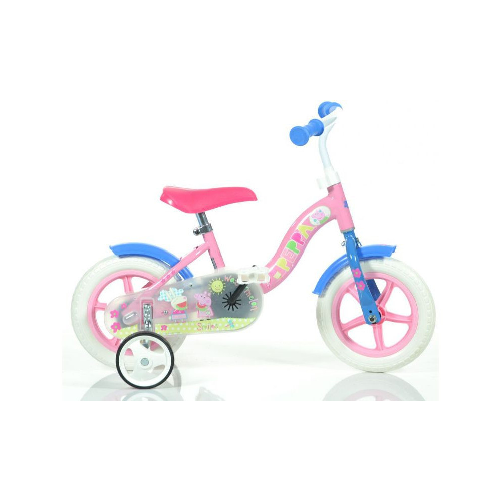 Gyermek kerékpár DINO Bikes - Gyermek kerékpár 10" Pepa Pig, gyártó Dino Bikes Olaszország a legkisebb gyermekek számára, akik meg akarnak tanulni kerékpározni. Teljes gumikerék felni felfújás nélkül, fék nélkül, fix áttétel (folyamatos pedálozás), a kerékpár segédkerékkel van felszerelve.