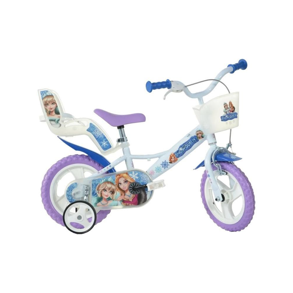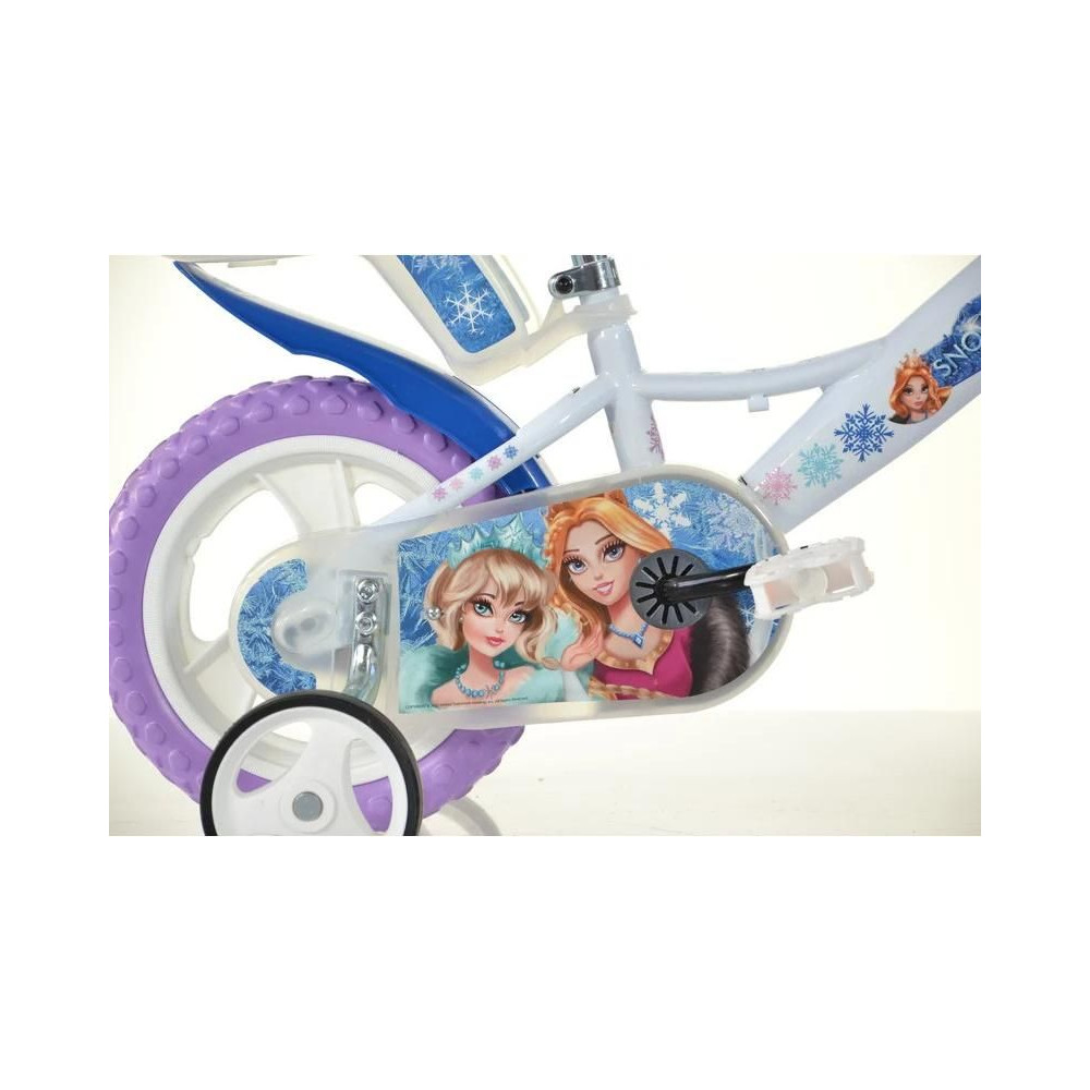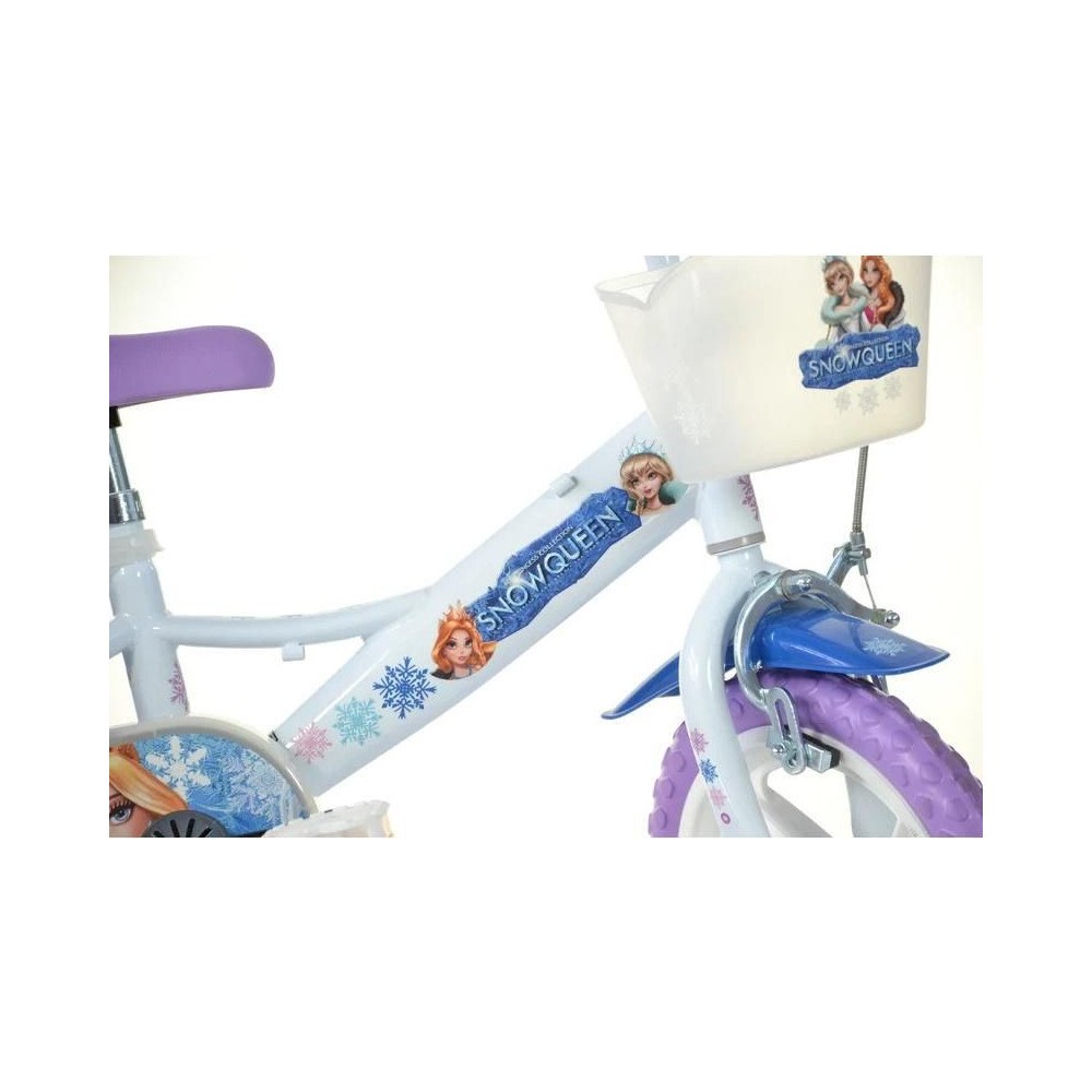 DINO Bikes - 12" Snow Queen gyerekbicikli babaüléssel és kosárral a kis kerékpárosoknak. Felni teljes gumival. Fix váltó, első féknyerges fék, kiegészítő kerekek, állítható ülés, gumikarok. A gyermek ajánlott életkora és magassága: 2-4 év, 87-120 cm.