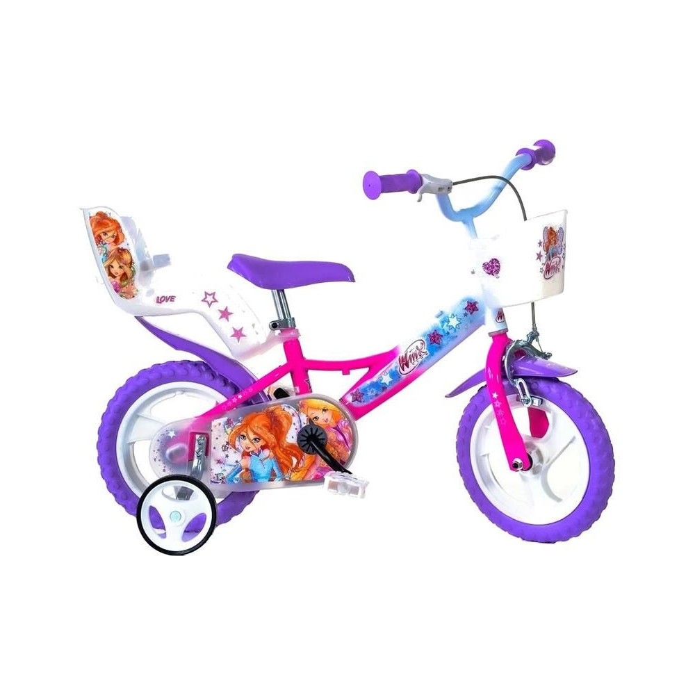 DINO Bikes - 12" Winx gyerekbicikli babaüléssel és kosárral a kis kerékpárosoknak. Felni teljes gumival. Fix váltó, első féknyerges fék, kiegészítő kerekek, állítható ülés, gumikarok. A gyermek ajánlott életkora és magassága: 2-4 év, 87-120 cm.