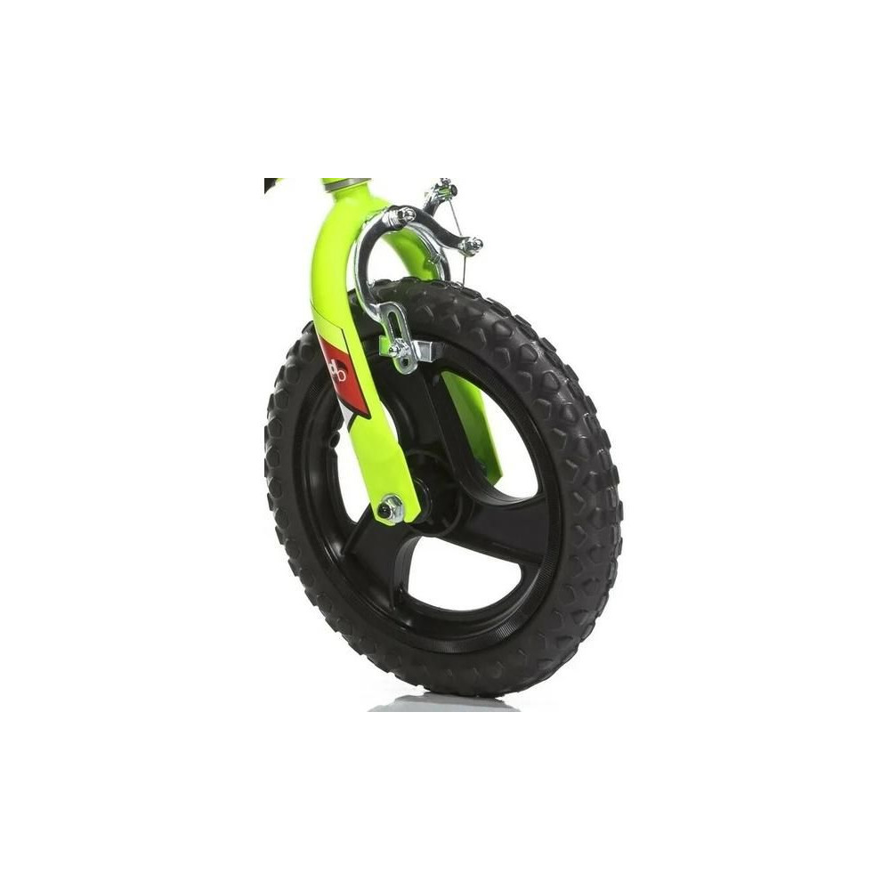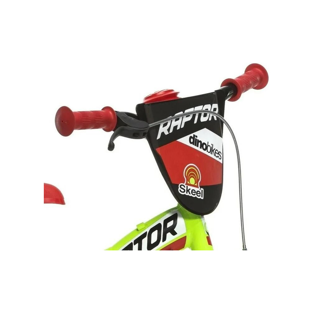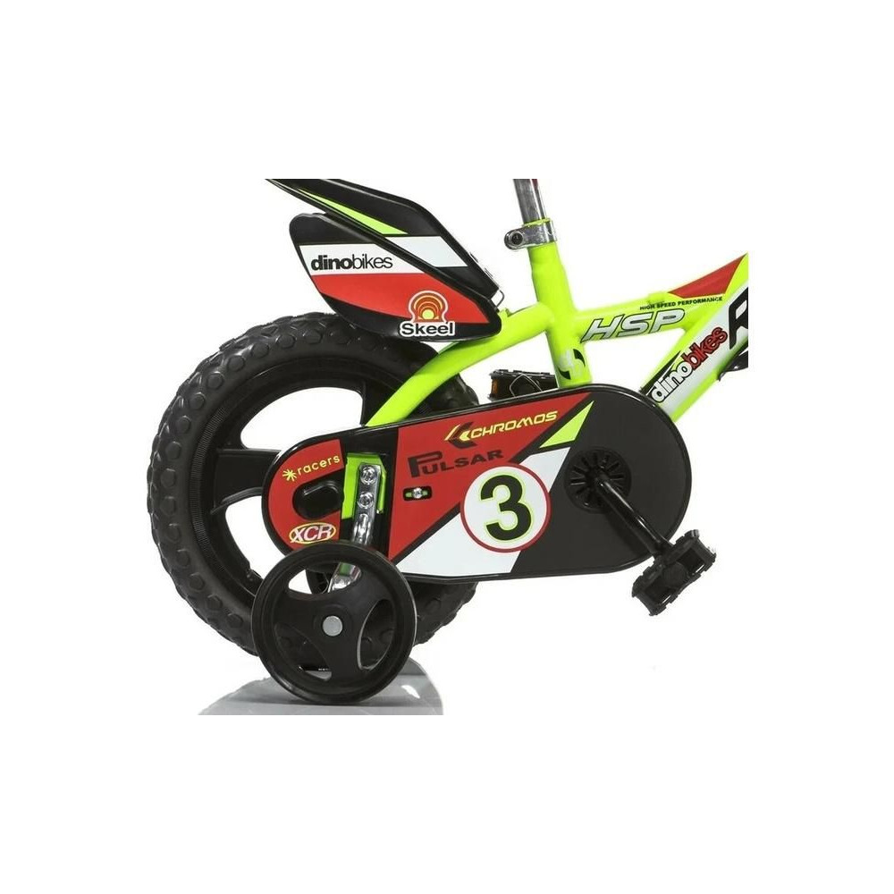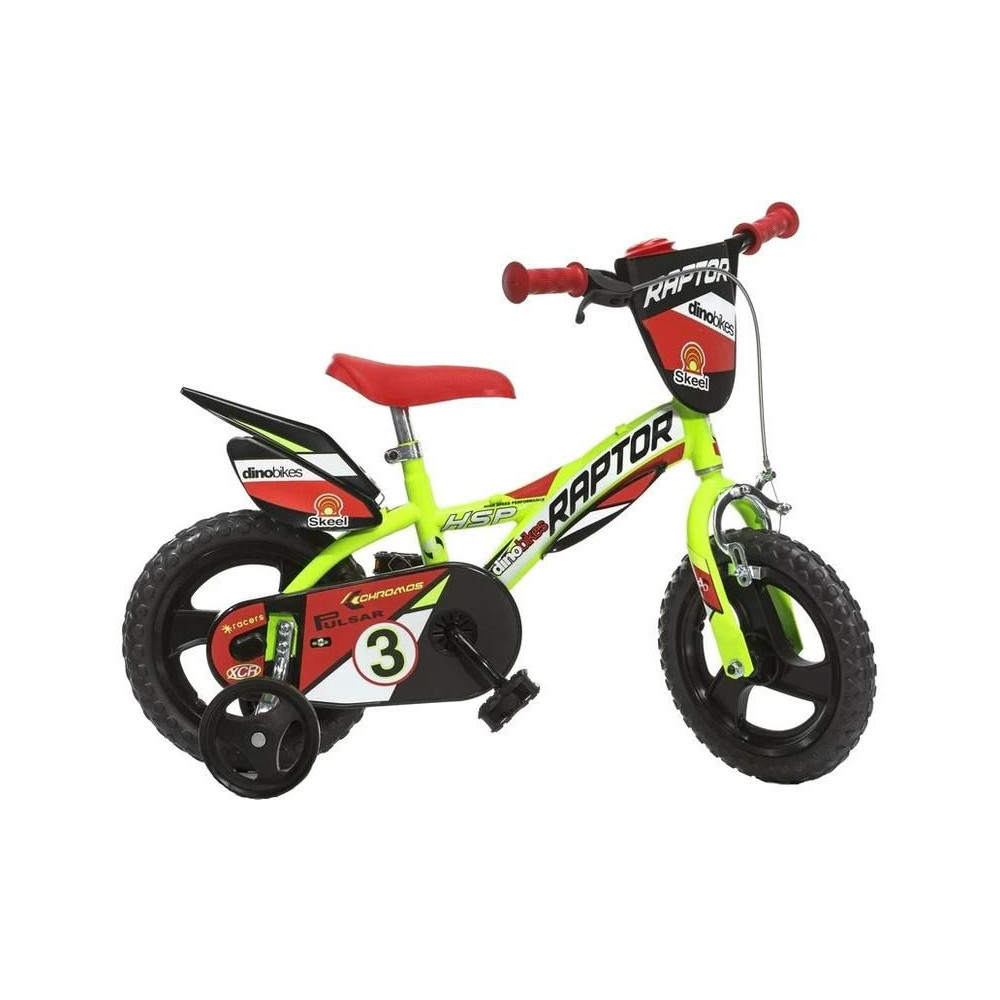 Gyermek sportkerékpár DINO Bikes - 12" Raptor - olasz gyártótól. Első féknyerges fék, állandó váltó, tömör gumiabroncsok defekt nélkül, segédkerékkel felszerelve. A gyermek ajánlott életkora és magassága: 2-4 év, 87-120 cm.