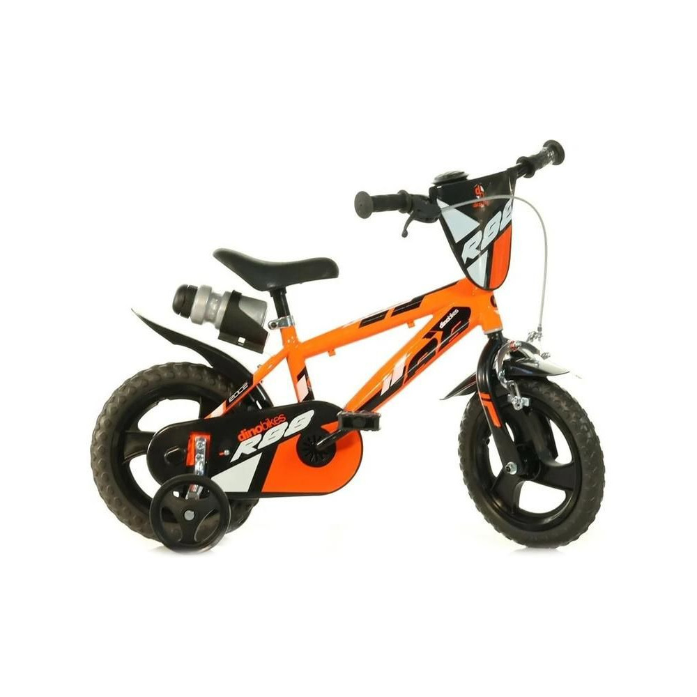 Gyermek kerékpár DINO Bikes - 12" narancssárga, kerékpár kis versenyzőknek. Műanyag felni teljes gumival (nem kell felfújni), első dobfékkel, fix váltóval, palacktartóval és láncvédővel. Ajánlott életkor és gyermekmagasság: 2-4 év, 87-120 cm.
