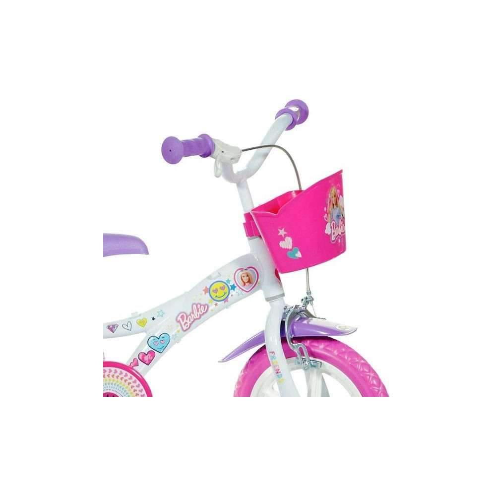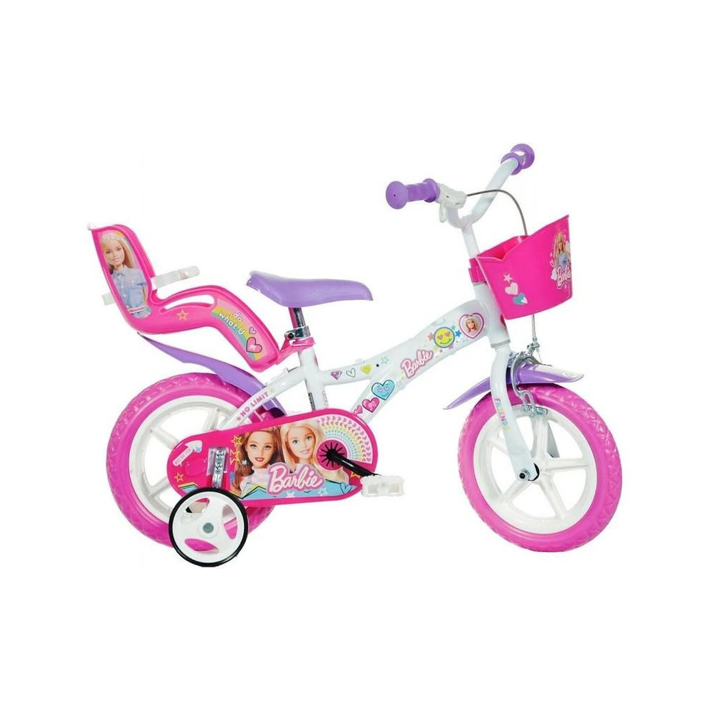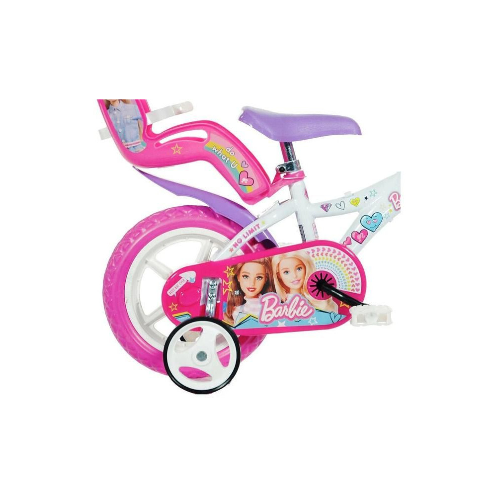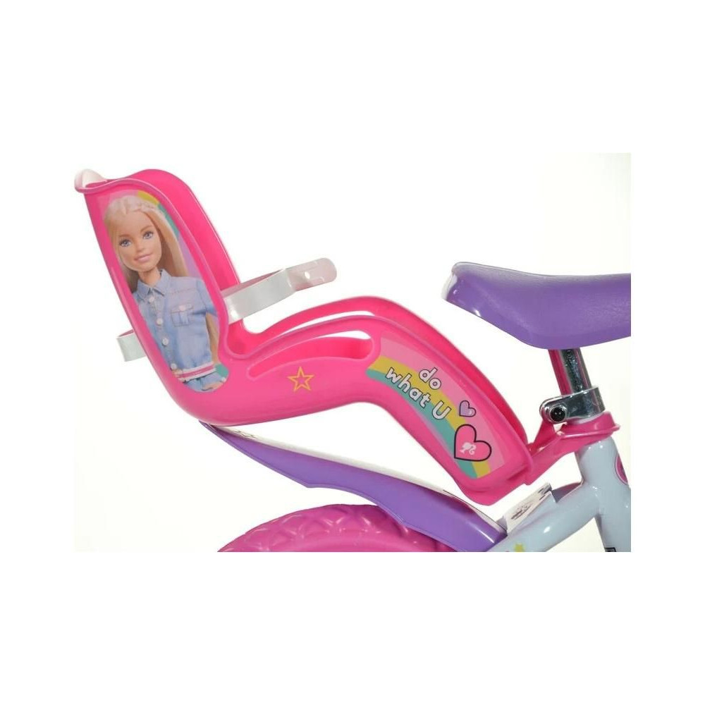 DINO Bikes gyerekbicikli - 12", csodálatos Barbie motívummal, üléssel a babának és kosárral a kis kerékpárosoknak. Felni teljes gumival. Fix váltó, első féknyerges fék, kiegészítő kerekek, állítható ülés, gumi markolatok. A gyermek ajánlott életkora és magassága: 2-4 év, 87-120 cm.