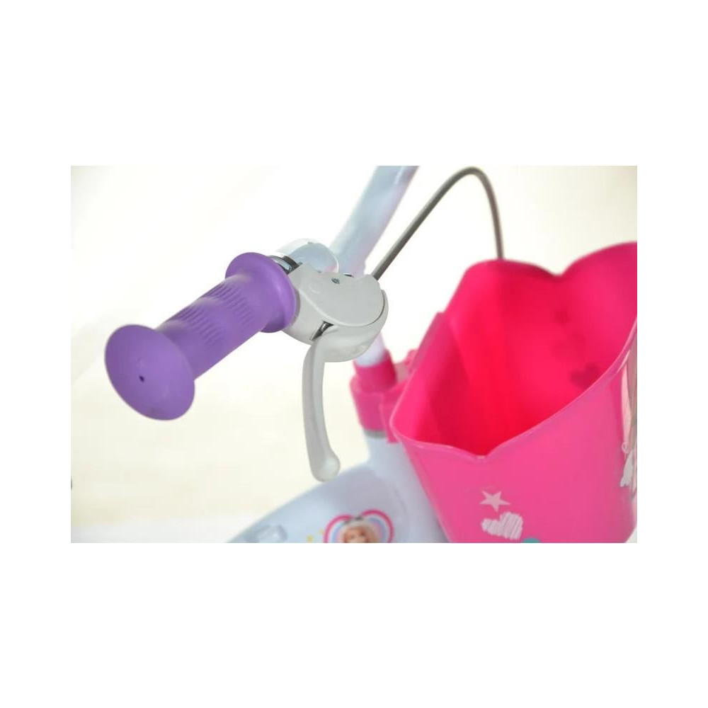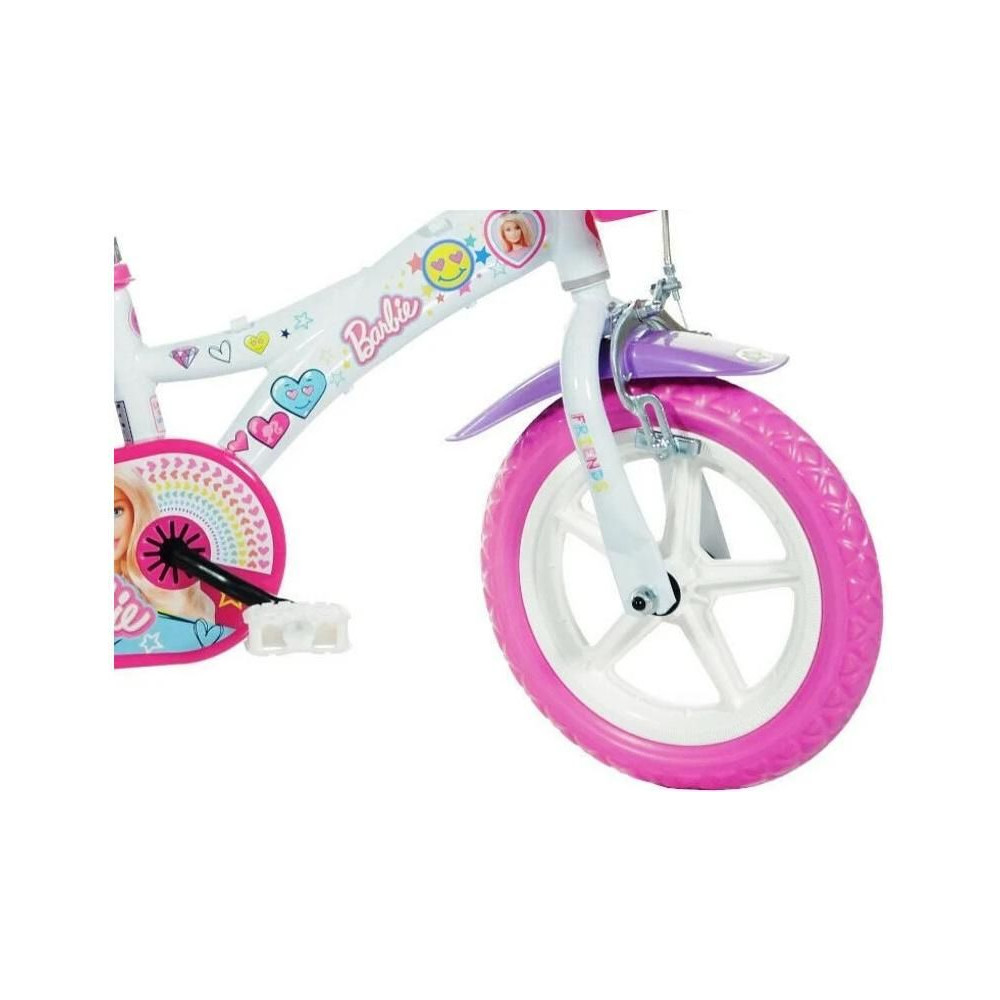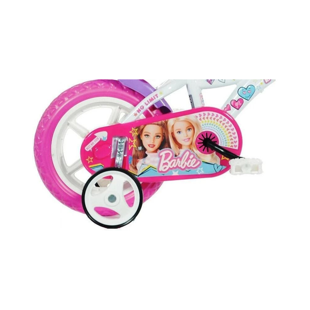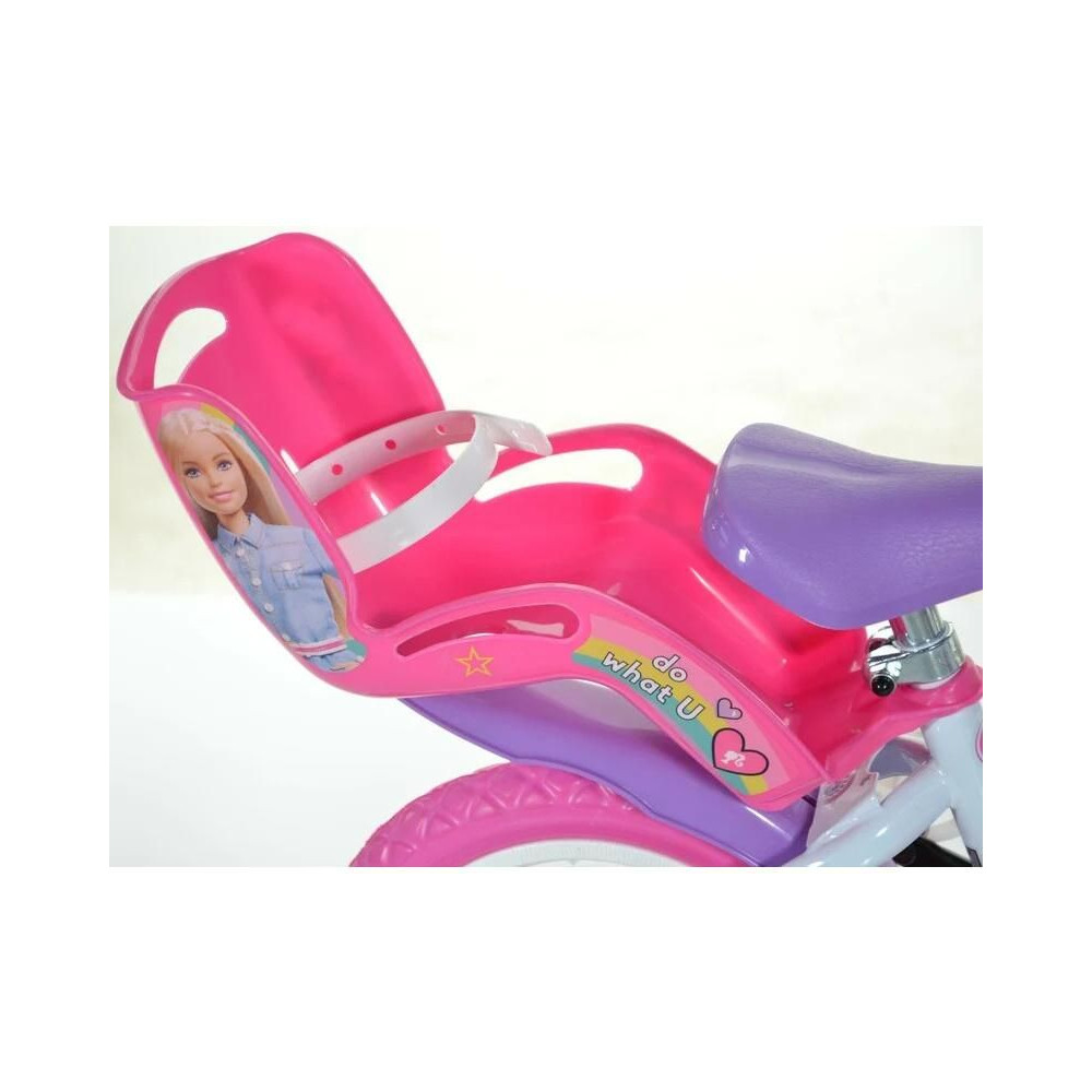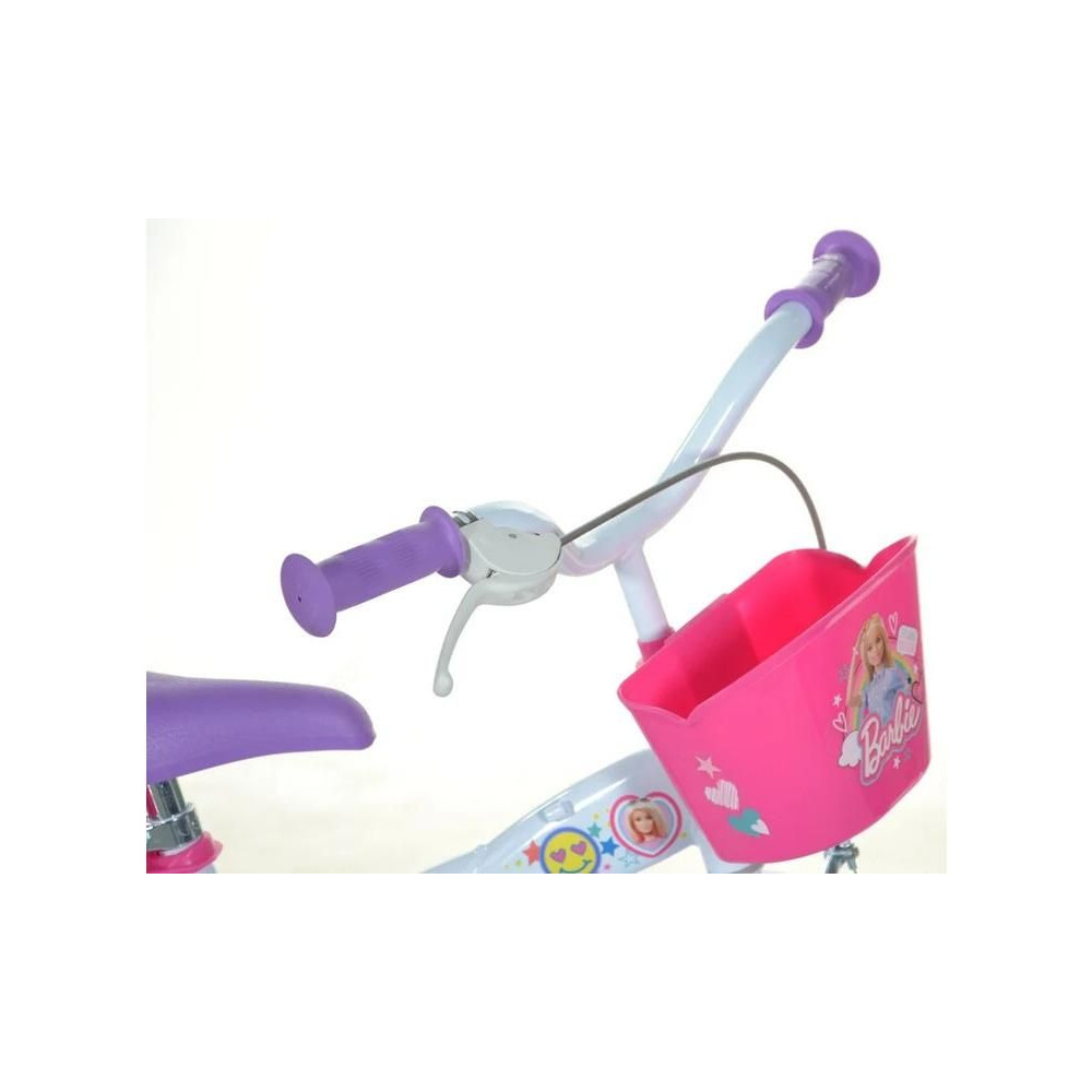 DINO Bikes gyerekbicikli - 12", csodálatos Barbie motívummal, üléssel a babának és kosárral a kis kerékpárosoknak. Felni teljes gumival. Fix váltó, első féknyerges fék, kiegészítő kerekek, állítható ülés, gumi markolatok. A gyermek ajánlott életkora és magassága: 2-4 év, 87-120 cm.