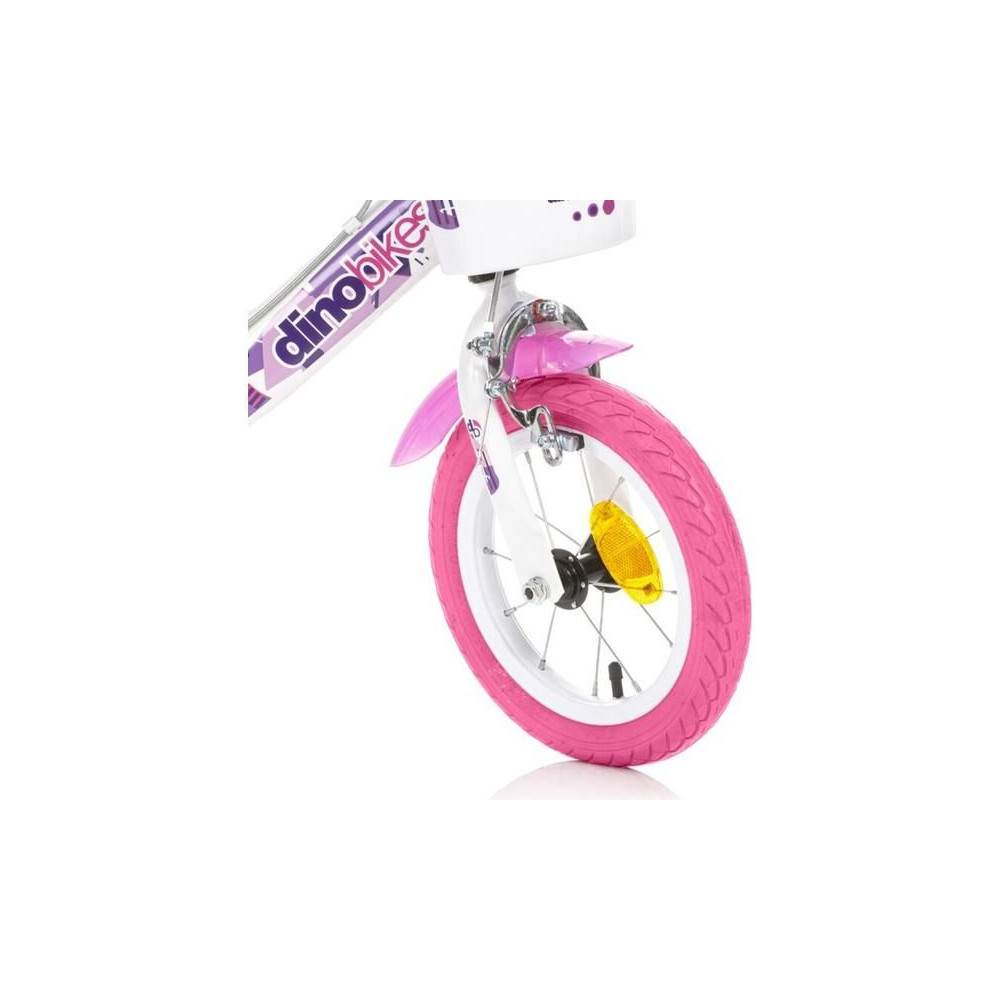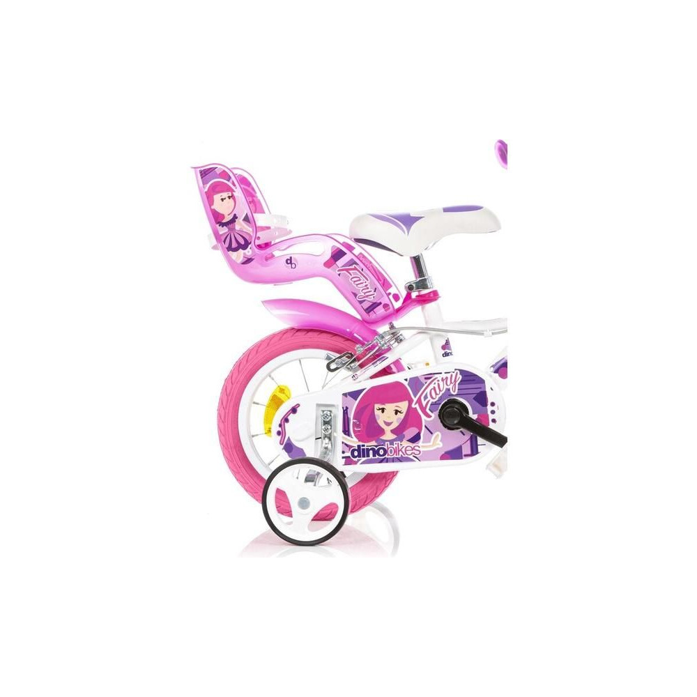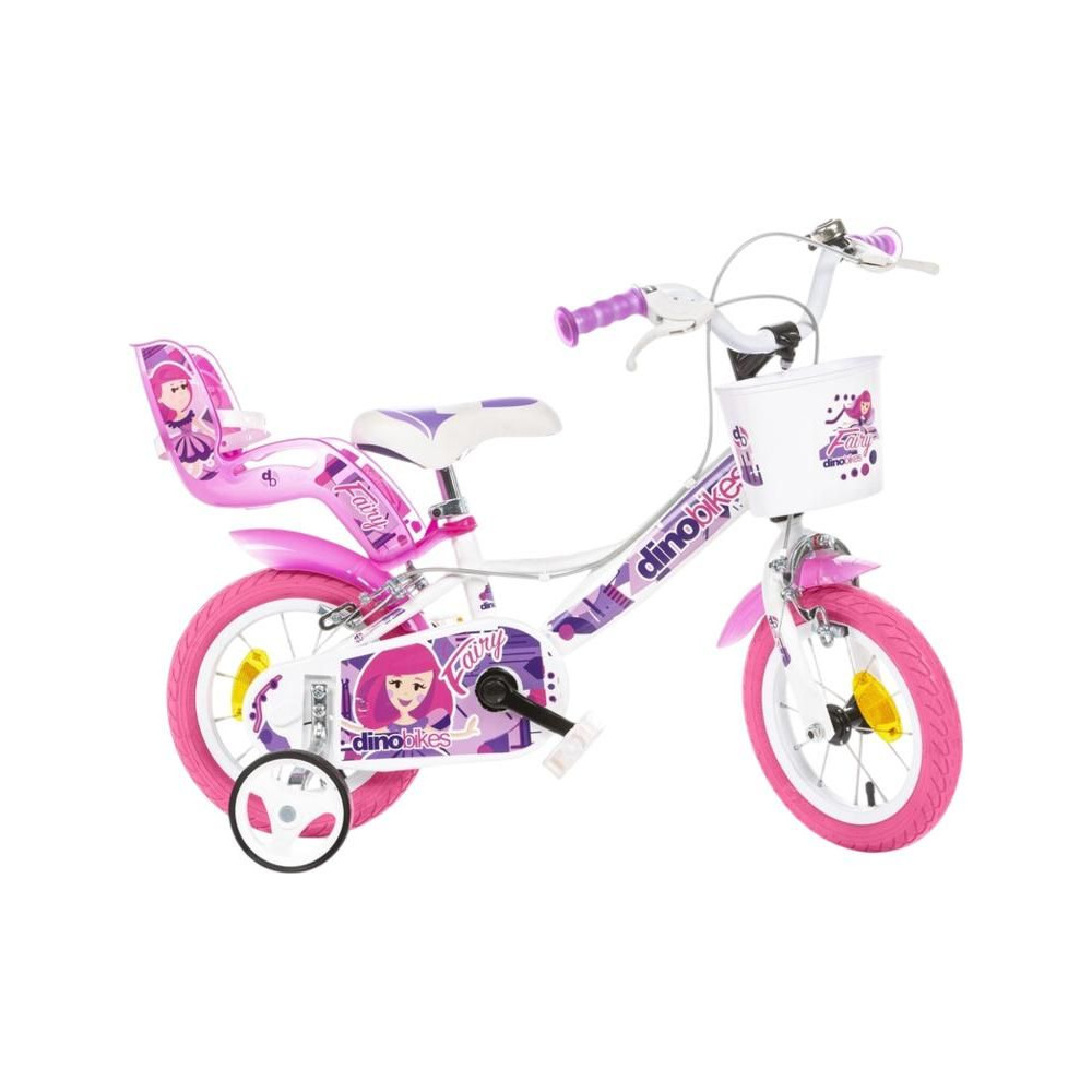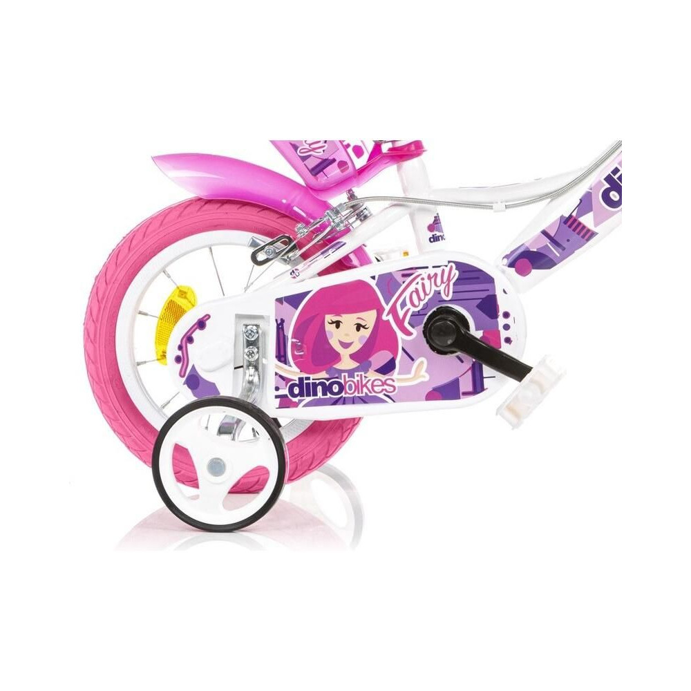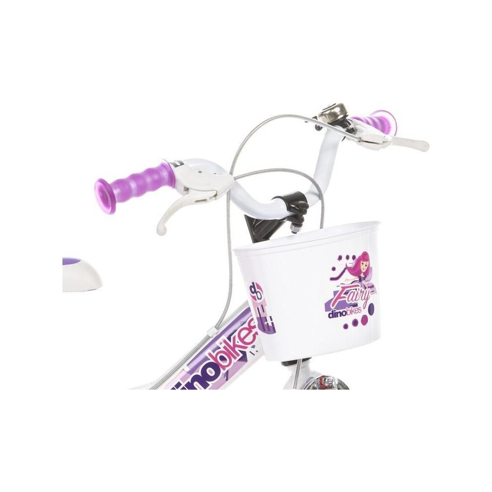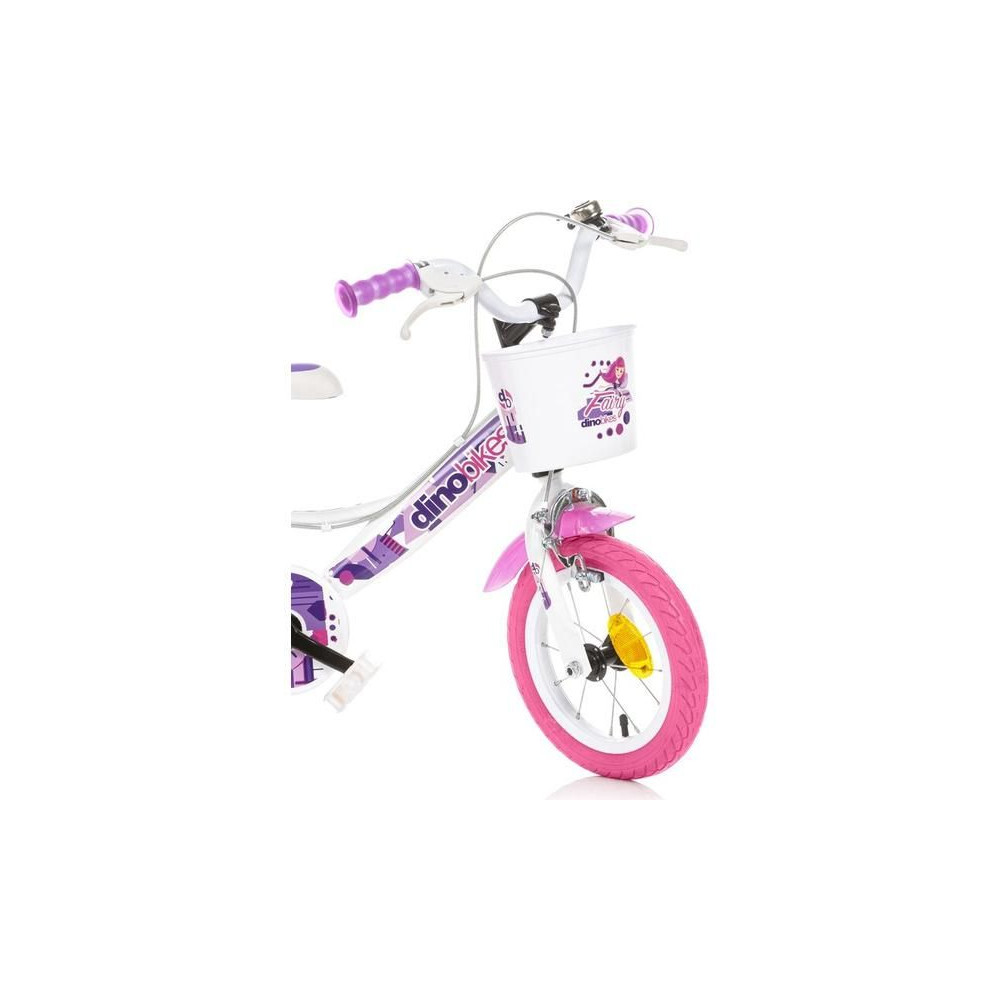 DINO Bikes gyerekkerékpár - 12" tündérfehér motívummal, babaüléssel és kosárral, tökéletes bringa kisebb kerékpárosok számára. Levegős gumik fém felnikkel, kiegészítő kerekek, szabadonfutó, mindkét keréken állkapocsfék. Bell.