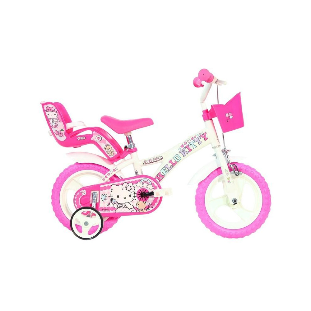 DINO Bikes - 12" Hello Kitty gyerekkerékpár babaüléssel és kosárral a kisebb kerékpárosoknak. Felni tömör gumival. Fix sebességváltó, elöl pofás fék, pótkerekek, állítható ülés, gumi fogantyúk. Ajánlott gyermekkor és magasság: 2-4 év, 87-120 cm.