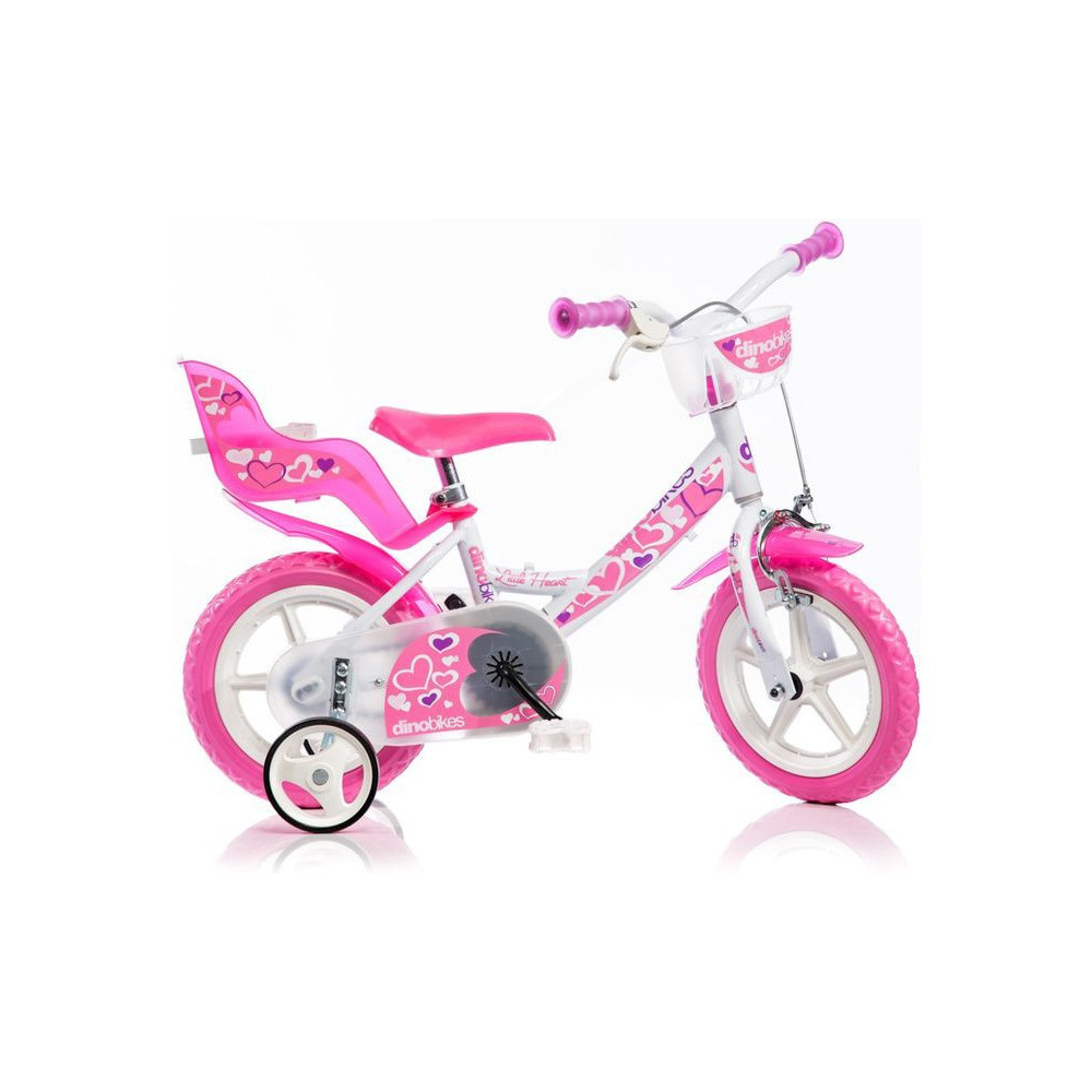 Dino Bikes - 12" fehér bababicikli babaüléssel és kosárral. Műanyag felni szilárd gumikkal (nem kell felfújni). Állandó sebességváltó, első féknyerges fék, mellékkerékkel, babahordozóval és kormánykosárral.