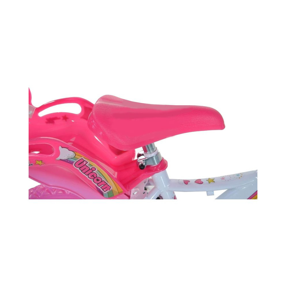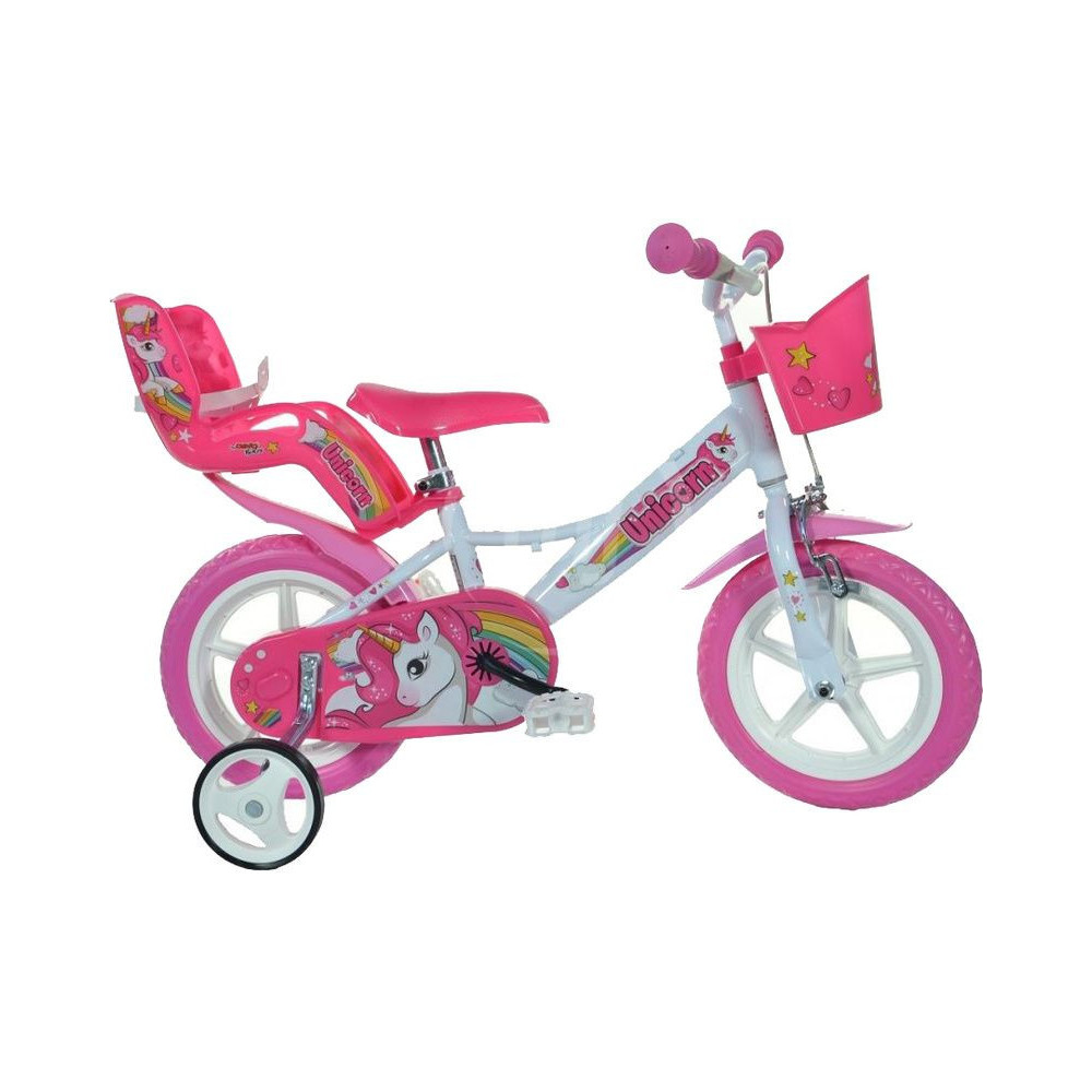 Bababicikli Dino Bikes - 12" Unicorn bababicikli üléssel és kosárral a kis kerékpárosoknak. A kerekek felni teljes gumival rendelkeznek, ami kiküszöböli a defekt lehetőségét, segédkerekek. Állandó sebességváltó, első féknyerges fék. Kb. 87-120 cm-es gyermekmagassághoz