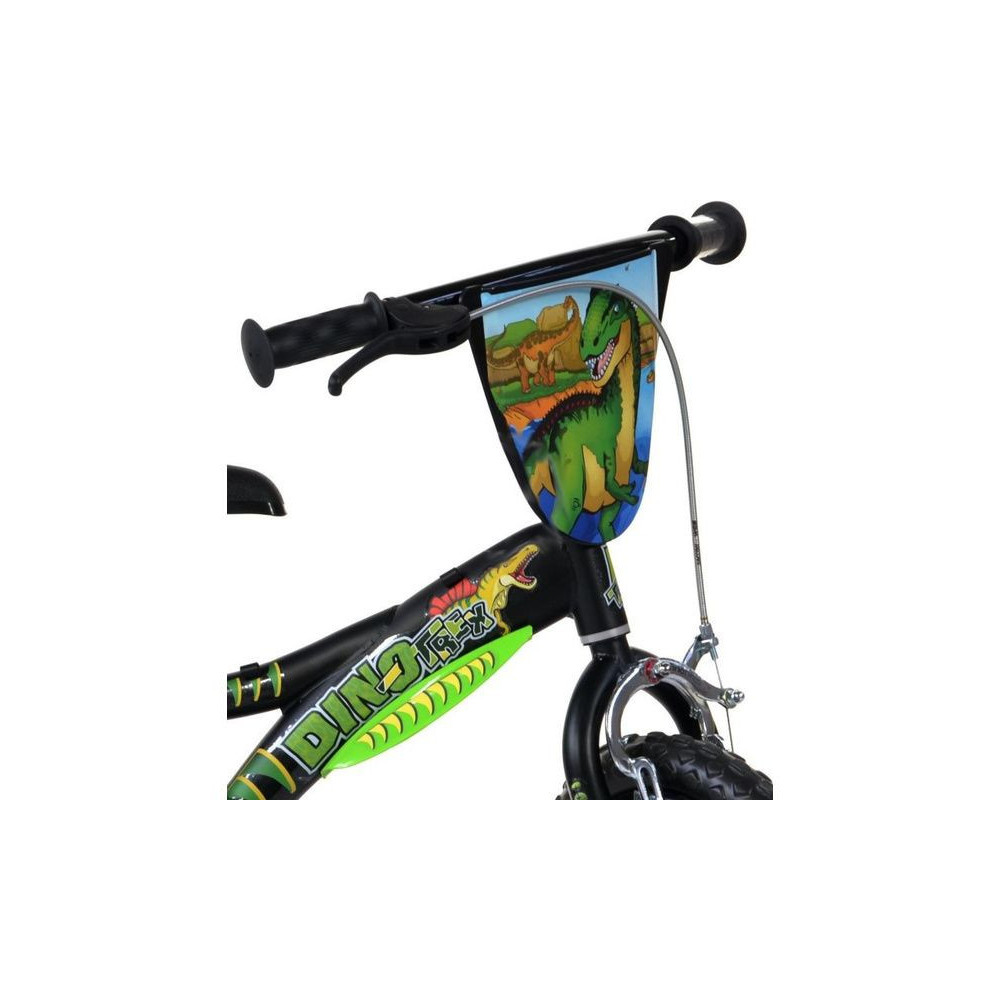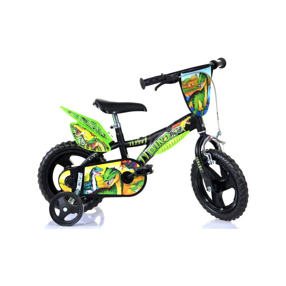 Stílusos, gyermek sportkerékpár DINO Bikes - 12" Dino T.Rex - az olasz gyártótól. Design motívum T.Rex, első féknyerges fék, hátsó fix áttétel, defektmentes tömör gumiabroncsok, segédkerékkel felszerelve. A gyermek ajánlott életkora és magassága: 2-4 év, 87-120 cm.