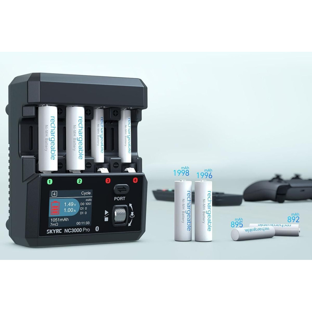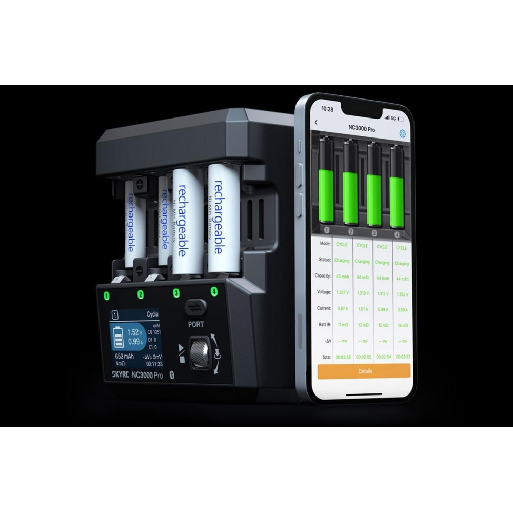 Intelligens töltő 1–4 NiMH AA/AAA akkumulátorhoz. Töltés 0,2–3 A, kisütés 0,2–2,5 A, ciklus, formázás, újraélesztés, gyors töltés, kisütés. Tápellátás USB-C forrásból QC2.0, PD/QC3.0 protokollal, min. 30 W teljesítménnyel. Okostelefonról vezérlés és firmware frissítés Bluetooth 5.0-n keresztül a SkyCharger alkalmazásban.Více informací