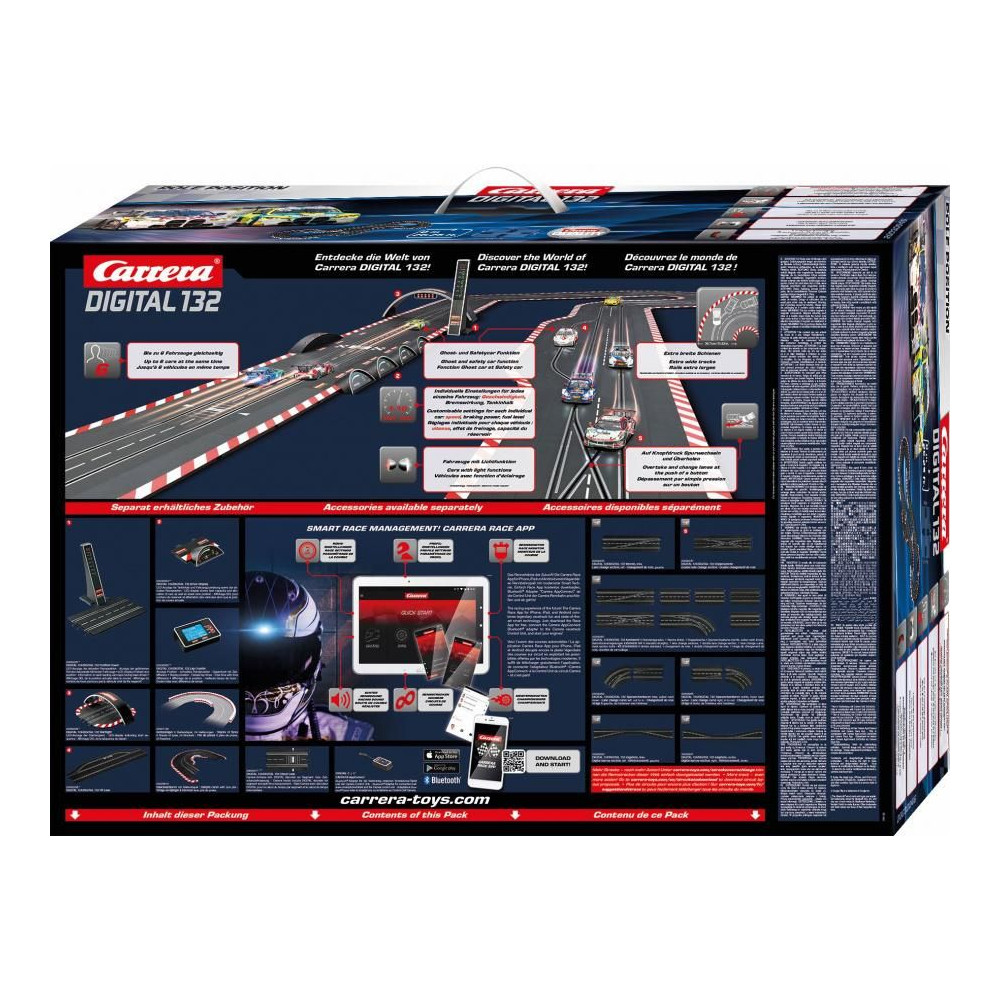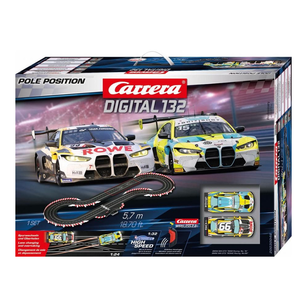 Az 5,7 méter hosszú Carrera Digital 132 versenypálya BMW M4 GT3 autókkal egyeneseket, kanyarokat, vezeték nélküli vezérlőket, bal és jobb oldali előzési szakaszt, teljesítmény-szakaszt és egyéb alkatrészeket tartalmaz.
