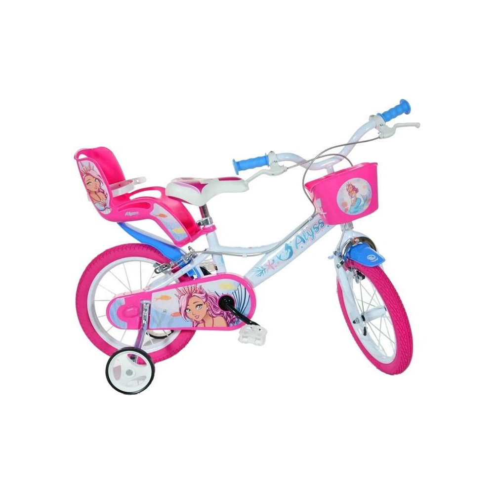 A DINO Bikes - 14"-os gyerekkerékpár Alyssa motívummal, babaüléssel és kosárral tökéletes kerékpár a kis kerékpárosok számára. Levegővel töltött gumiabroncsok fém felnivel, extra kerekek, szabadonfutó áttétel, mindkét keréken féknyerges fék.
