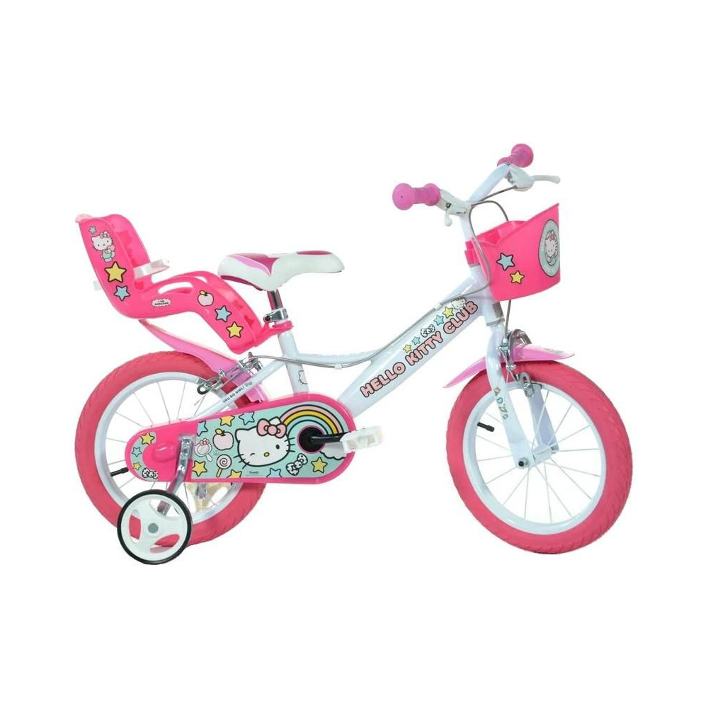 A DINO Bikes - 14"-os gyerekkerékpár a népszerű, engedélyezett Hello Kitty 2 motívummal, babaüléssel és kosárral tökéletes kerékpár a kis kerékpárosok számára. Levegővel töltött gumiabroncsok fém felnikkel, extra kerekek, szabadonfutó áttétel, mindkét keréken féknyerges fék.