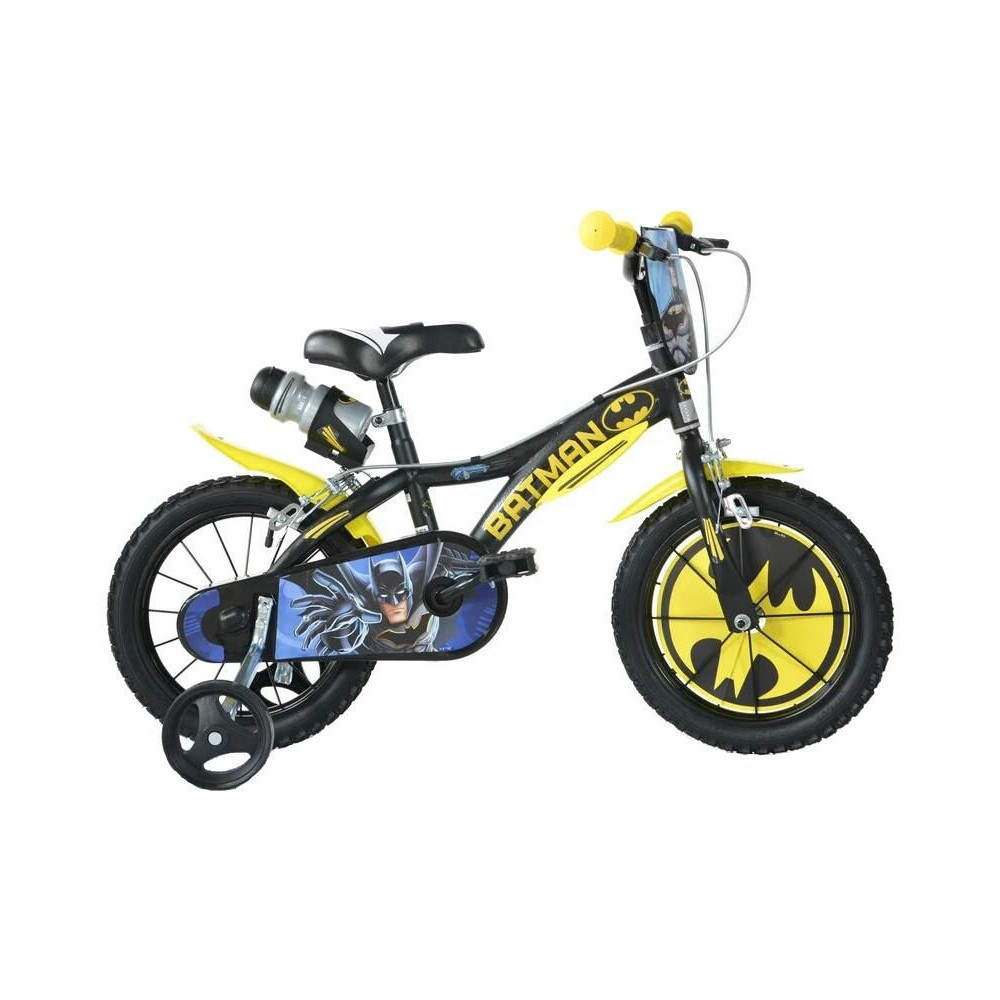 DINO Bikes - 14"-os gyerekkerékpár Batman motívummal. Levegővel töltött gumiabroncsok drótkötésű felnivel, szabadonfutó áttétel, mindkét keréken féknyerges fék, palacktartó. Ajánlott életkor és gyermekmagasság: 3-5 év, 95-127 cm.