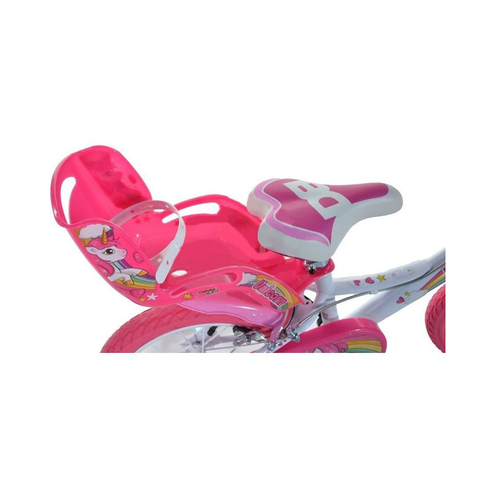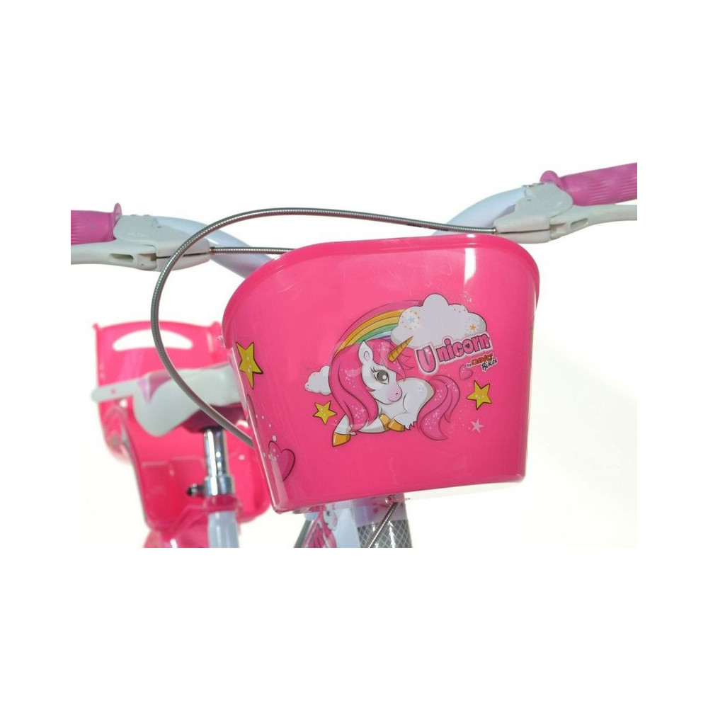 A DINO Bikes - 14" Unicorn babaüléssel és kosárral tökéletes kerékpár a kis kerékpárosok számára. Kiváló minőségű, légtöltésű gumiabroncsok fém tárcsákkal és szabadonfutó fogaskerékkel, mindkét keréken féknyerges fékkel.