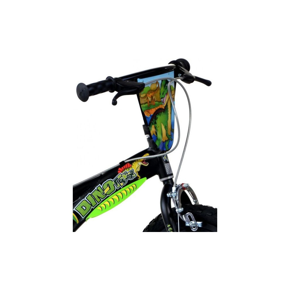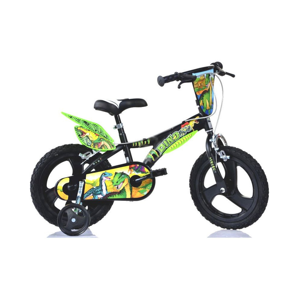 Modern gyermekkerékpár 14" Dino T.Rex az olasz DINO Bikes gyártótól. Stílusos dinoszaurusz motívummal. Elöl és hátul erős féknyerges fékek, masszív váz Hi-ten acélból, léggumi, segédkerekek. Ajánlott életkor és gyermekmagasság: 3-5 év, 95-127 cm.