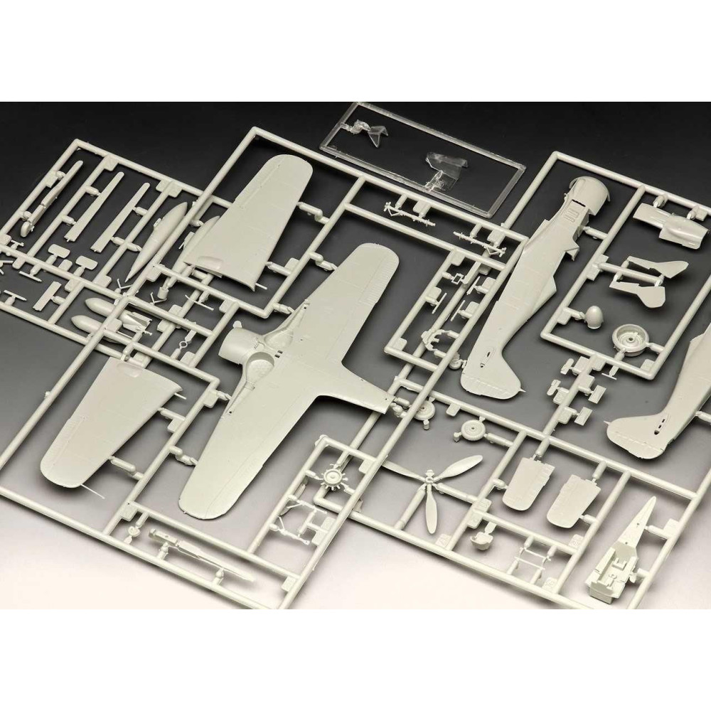 Repülőgépmodell összeragasztásához. Méret: 1:72; 12,3 cm. 46 darab összeragasztandó darab, ragasztó, ecset és festékek.