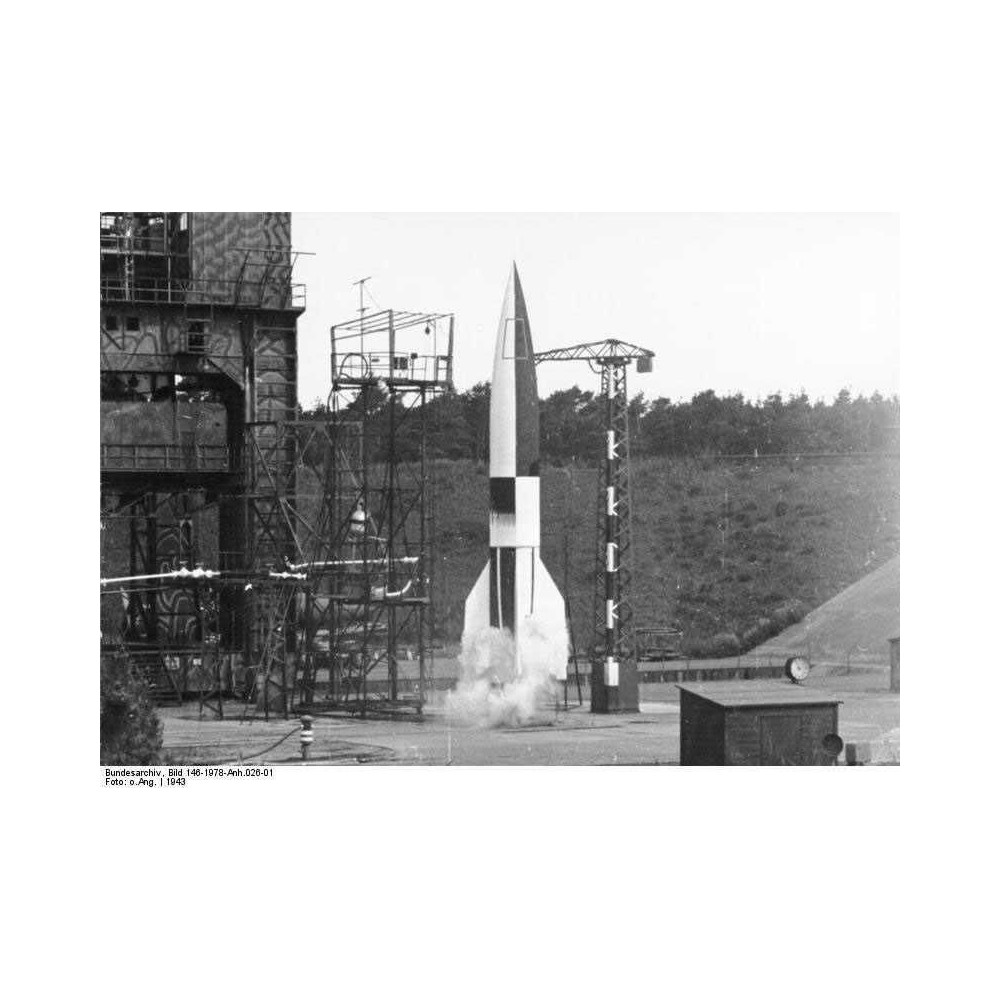 A nagy német A4/V2 rakéta modellje, amely folyékony hajtóművével az első repülő tárgy lett, amely átlépte az űr határát.
