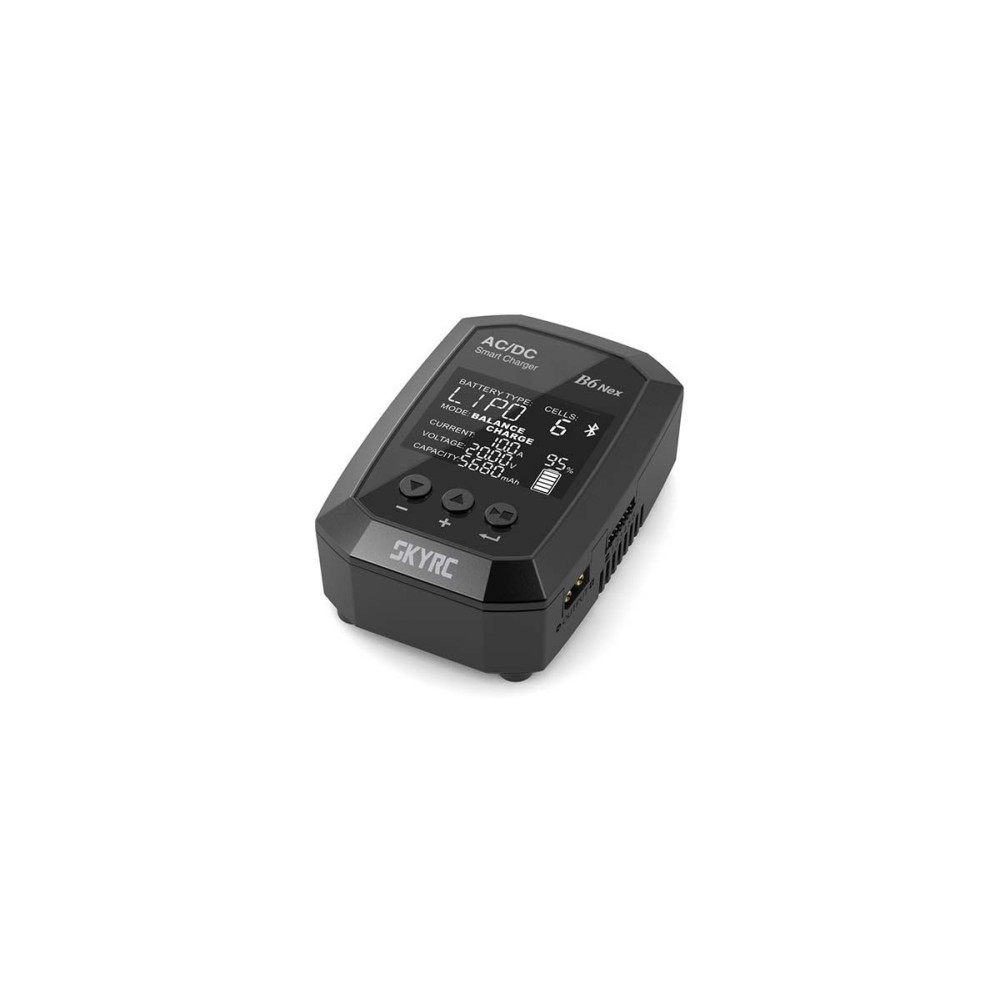 A B6 Nex 200W-os miniatűr töltőt azzal a céllal tervezték, hogy egy intelligens, nagy teljesítményű és állandó feszültségű töltőt biztosítson nagyon egyszerű és egyszerű működés mellett. A B6 Nex lehetővé teszi az általános cellatípusok (NiCd, NiMH, LiPo, LiHV, Li-ion, LiFe, Pb) töltését és kisütését, és beépített kiegyensúlyozóval van felszerelve, amely biztosítja a lítium akkumulátorok nagyon biztonságos töltését. A töltő Bluetooth 5.0 interfésszel van felszerelve, amely az okostelefonra (iOS és Android) telepített SkyCharger alkalmazáshoz csatlakoztatva lehetőséget biztosít a paraméterek kényelmes és nagyon egyértelmű beállítására, a töltési/kisütési folyamat vezérlésére és ellenőrzésére.