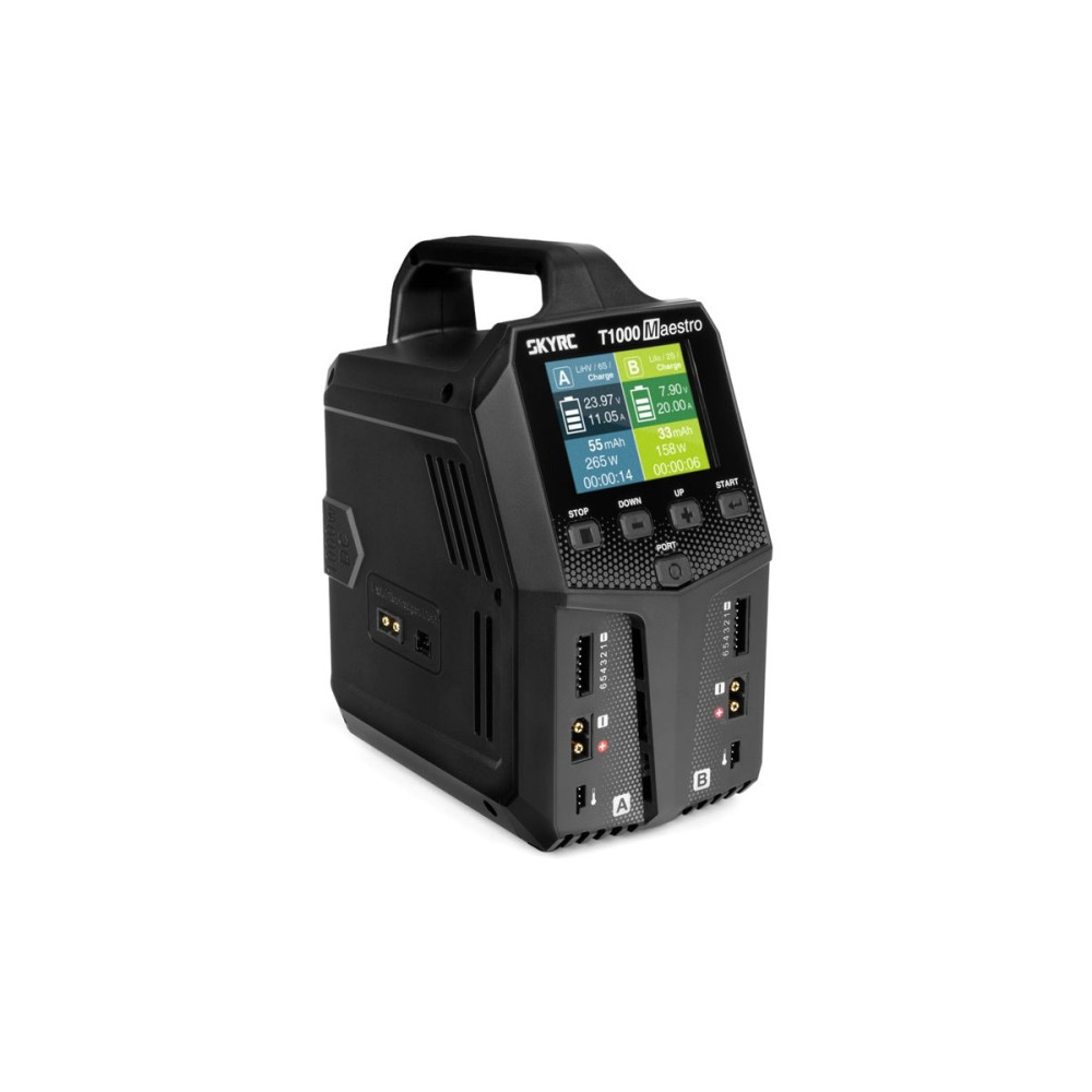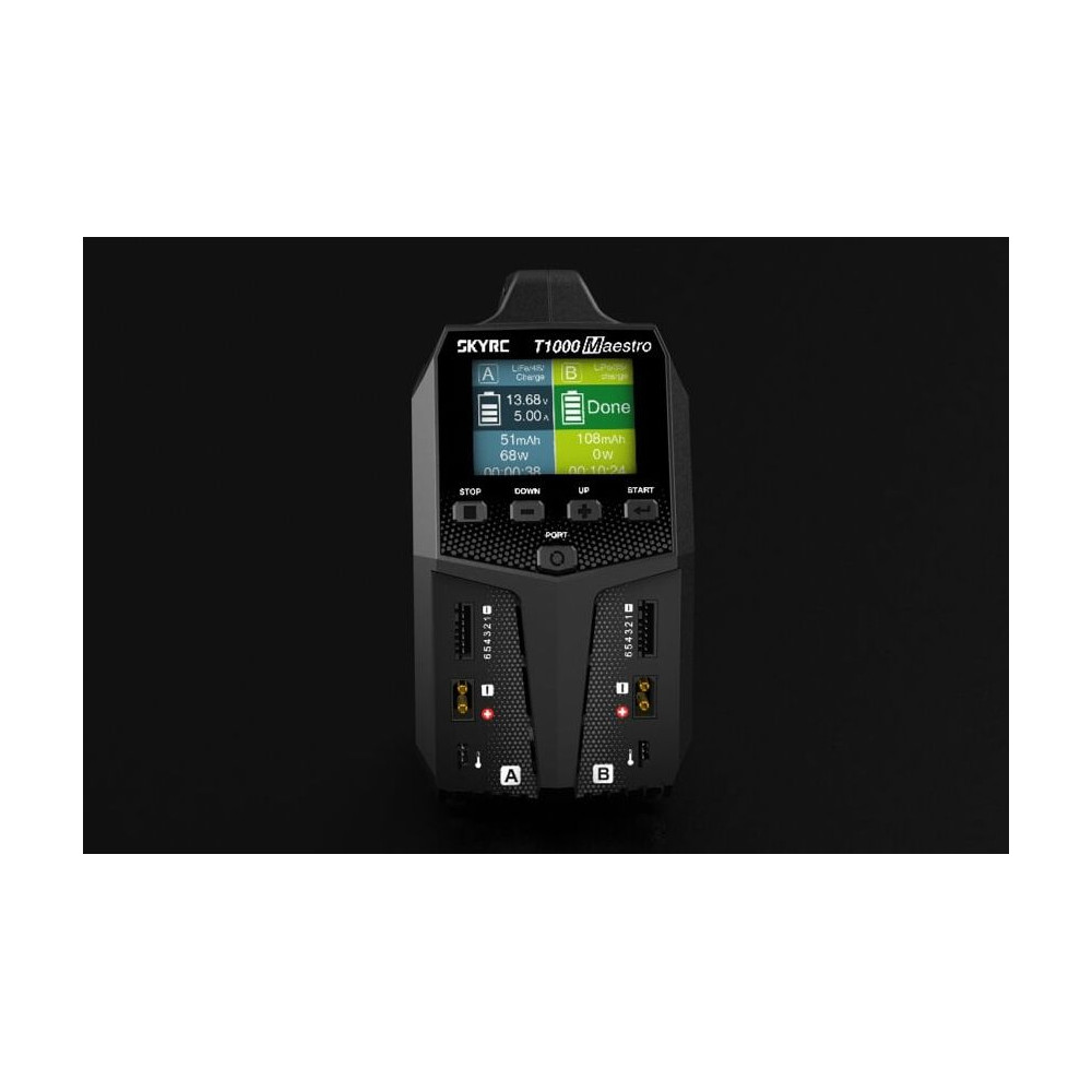 A töltő mindkét csatornán XT60 kimeneti aljzatokkal és JST-XH szervizcsatlakozókhoz való univerzális aljzatokkal rendelkezik, amelyek lehetővé teszik az akkumulátorok tápkábeleinek és a 2-6S szettek JST-XH szervizcsatlakozóinak közvetlen csatlakoztatását - ha XT60 és JST-XH csatlakozókkal ellátott szetteket használ, akkor teljesen lemond a töltőkábelekről és adapterekről. Más rendszerek szervizcsatlakozóinak csatlakoztatásához használhatja a szabványos Sky RC vagy RC System adaptereket.