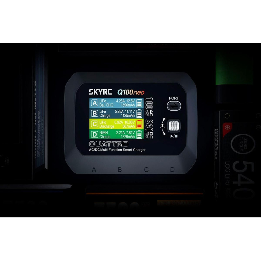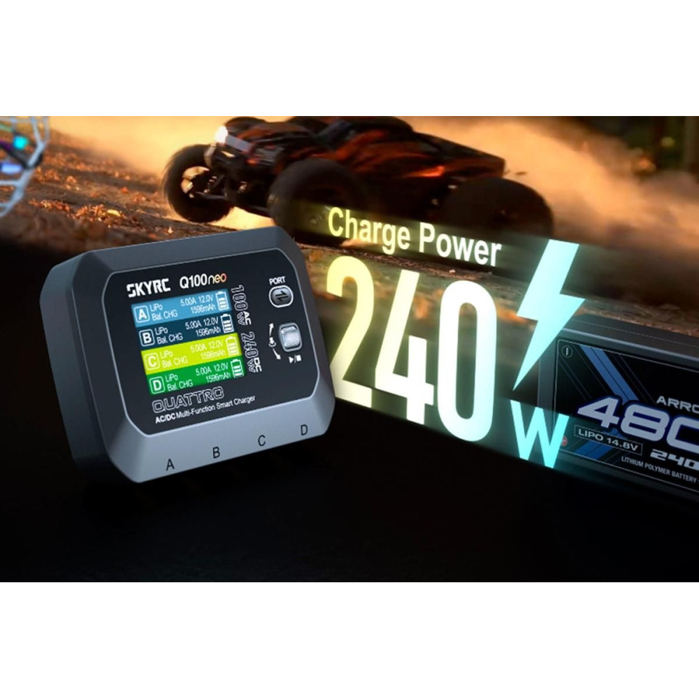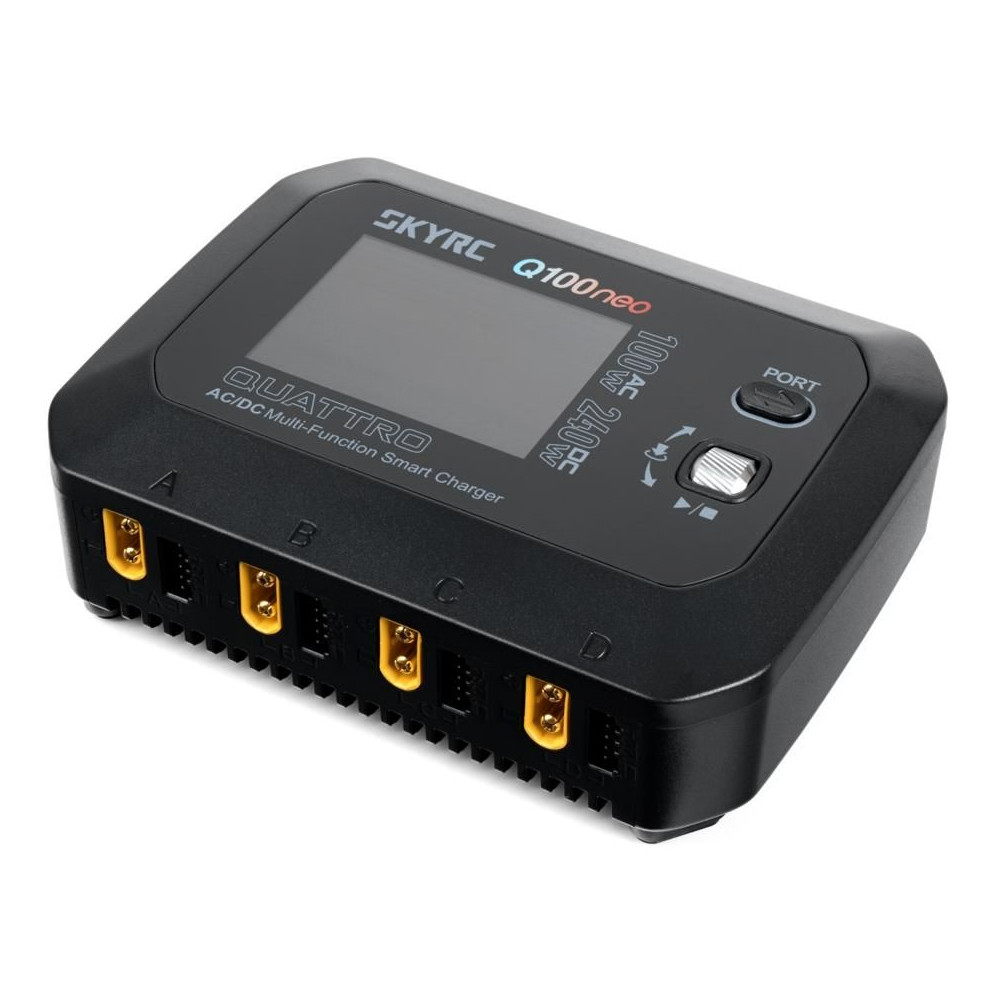 A négycsatornás SKY RC Q100neo 240W töltőt azzal a céllal tervezték, hogy mindent biztosítson négy - jóval kisebb kapacitású - akkumulátor egyidejű töltéséhez "egy fedél alatt", beleértve a hálózati adaptert is, egyszerű kezeléssel. A Q100neo lehetővé teszi a gyakori típusú cellák (NiCd, NiMH, Li-polimer, Li-ion, Li-Fe, Li-HV, Pb) töltését és kisütését, továbbá minden csatorna beépített négycsatornás balanszerrel van felszerelve, amely biztosítja a lítium akkumulátorok nagyon biztonságos és kényelmes töltését.