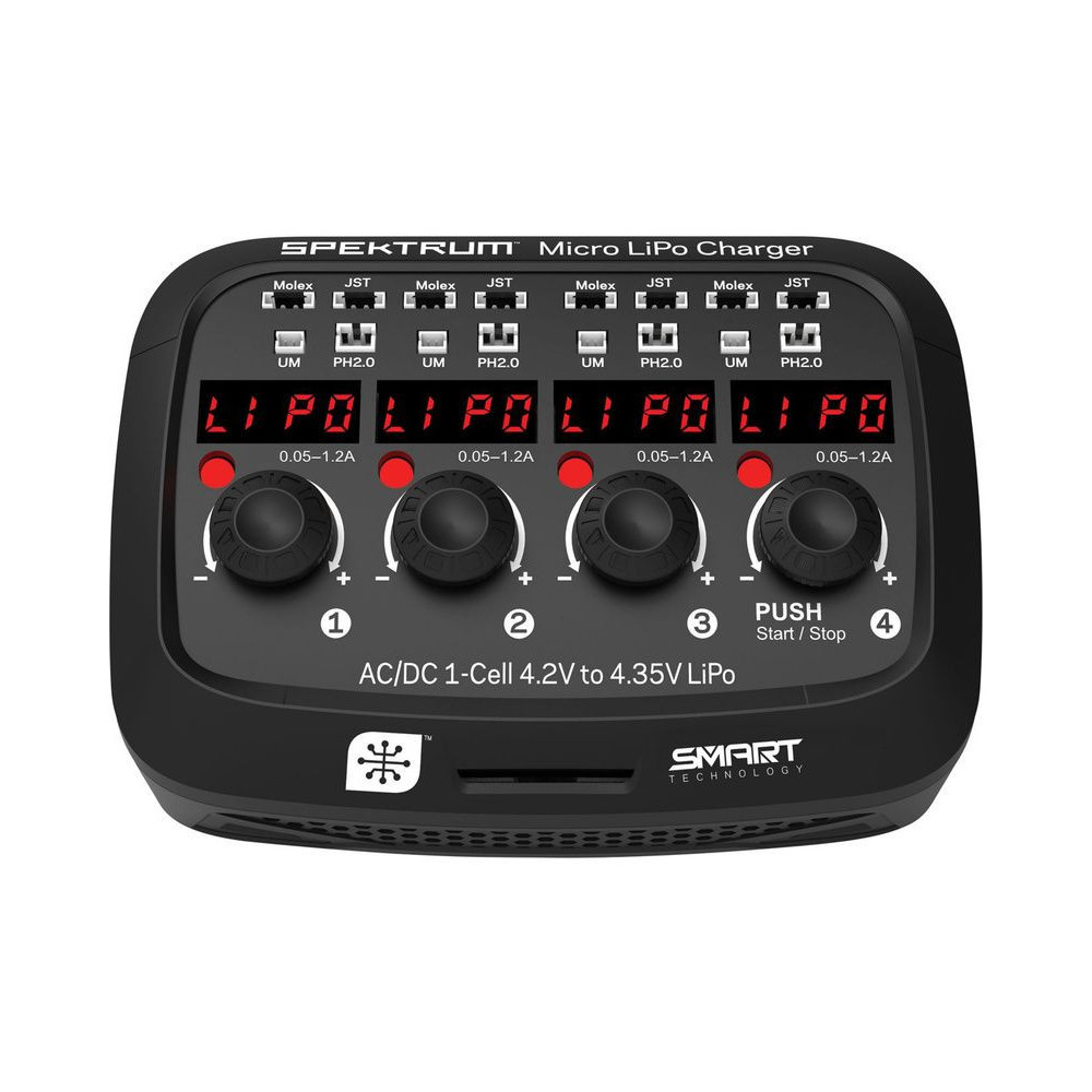 Spektrum Smart Micro töltő 4db 1 cellás mikro LiPol akkumulátorhoz Molex, JST, UM és PH csatlakozókkal. Egyenletes áram szabályozás 0,05 - 1,2A. A Spektrum Smart technológiának köszönhetően, a LED kijelzővel ellátott digitális állapotkijelző közvetlenül a csatlakozás után fontos információkkal szolgál az akkumulátorról. 4 független töltőcsatorna minden típusú csatlakozóval.