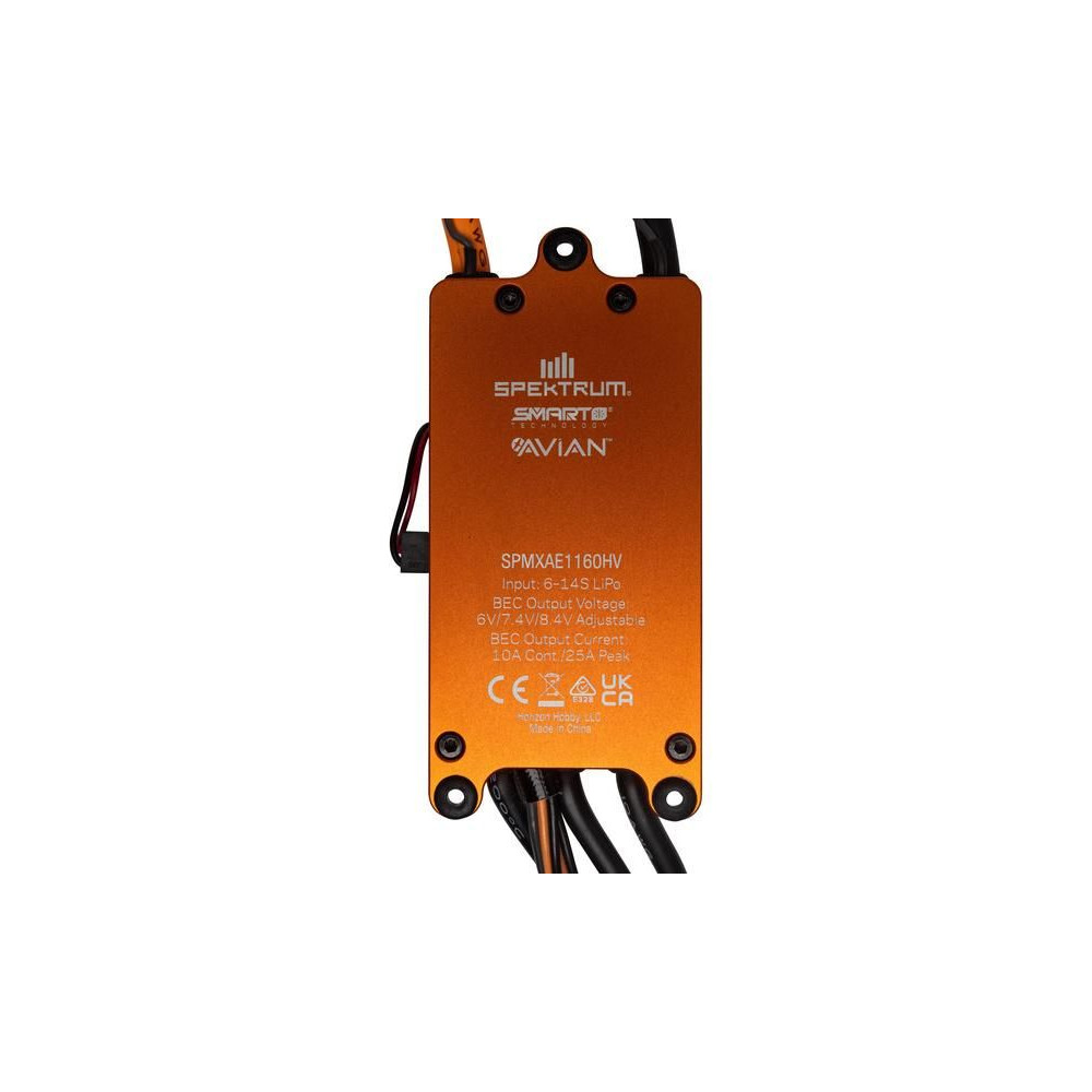 Spektrum Smart Avian 160A HV repülőgép-vezérlő 6-14 LiPol cellához, IC5 csatlakozóval, SMART telemetriával, amelyet kompatibilis Spektrum telemetriás vevőkészülékeken keresztül továbbítanak. Méretek 88x50x36mm, súly 376g.
