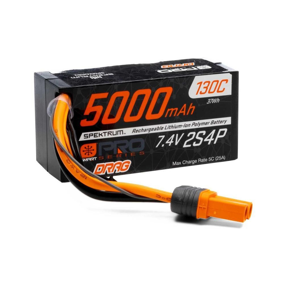 Új, nagy teljesítményű Spektrum Smart Pro LiPo 7.4V 5000mAh akkumulátor, 130C kisülés, IC5 csatlakozó és hardcase kialakítás. Töltés 5C-ig a szupergyors töltés érdekében az akkumulátor károsodása nélkül. Méretek 40x47x96mm