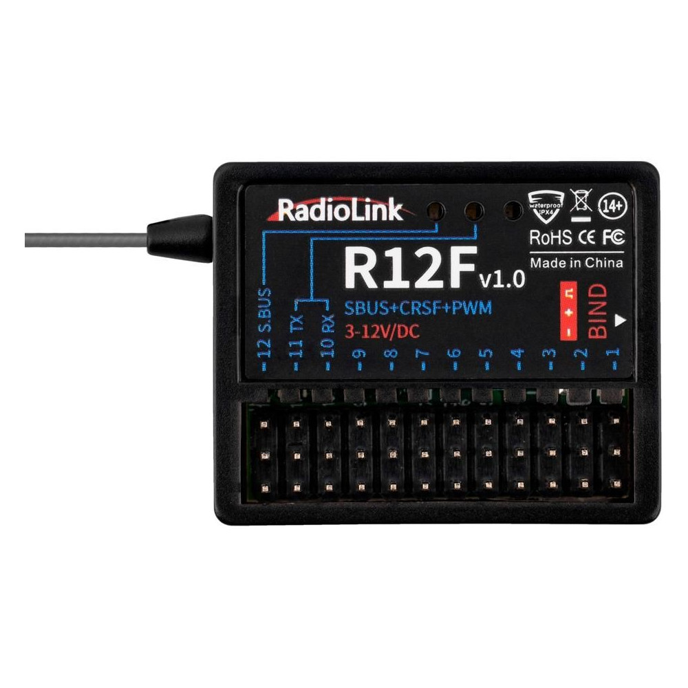 Tizenkét csatornás 2,4 GHz-es FHSS vevő telemetria nélkül Radiolink T12D és T16D adókhoz. Működési módok: PWM, PWM+S.BUS, PWM+CRSF+S.BUS, PWM+CRSF. Méretek: 35,6x25x13,6 mm, súly: 11,8 g.
