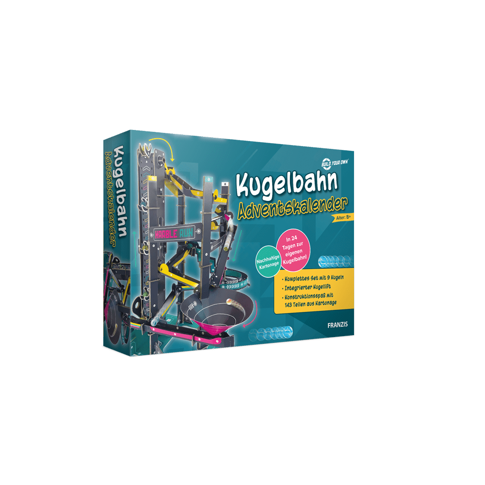 Celkovo 143 zasúvacích dielov z pevného kartónu vytvára pôsobivú guľôčkovú dráhu s výškou 50 cm. Za 24 dvierkami adventného kalendára nájdete podrobný návod na zostavenie sady krok za krokom. A čo je najlepšie: nie je potrebné žiadne lepidlo! Pri výbere komponentov sa kládol veľký dôraz na udržateľnosť - zábava bez plastu!