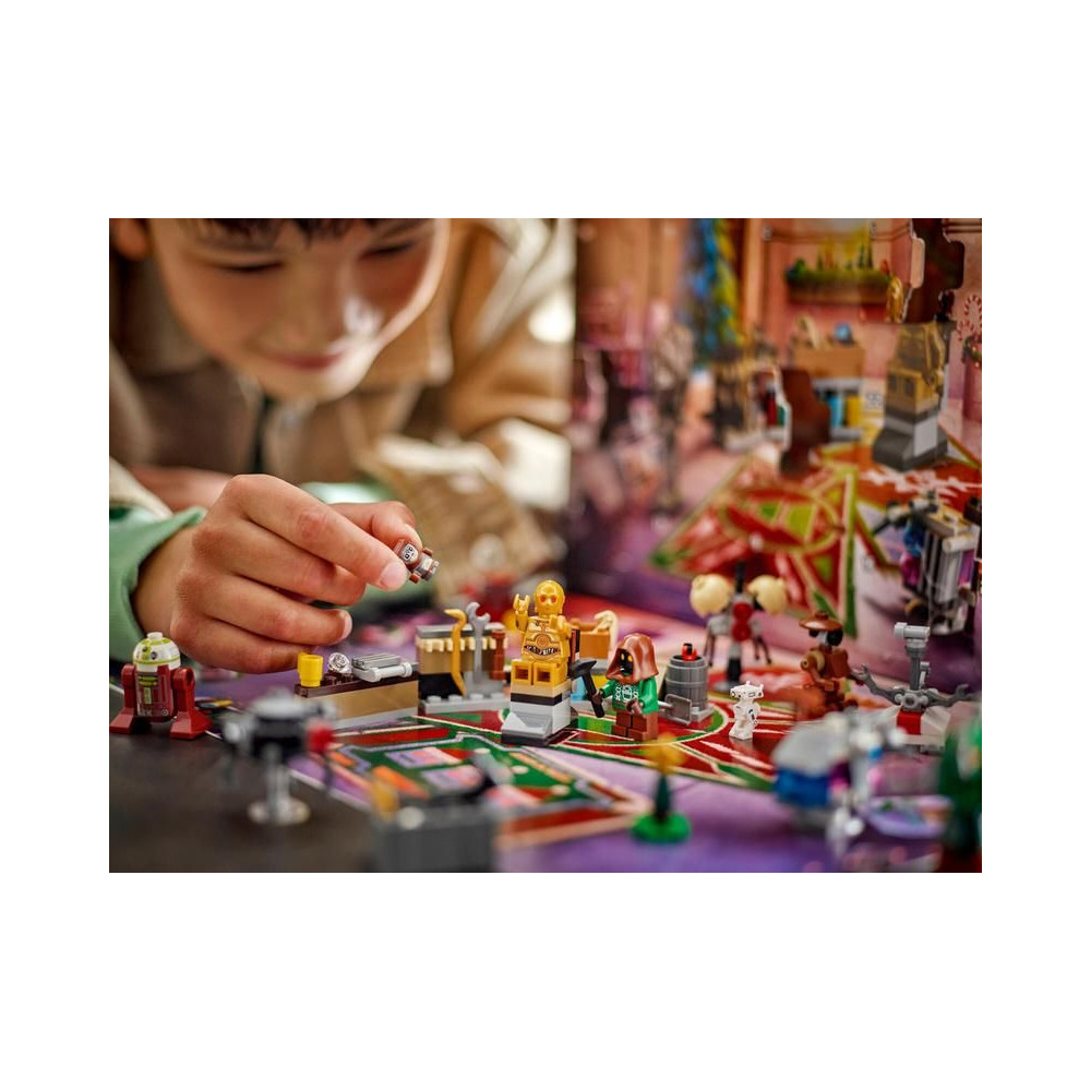 Fedezd fel BB-8-at hóember jelmezben, Jawst, Egérdroidot és Doktordroidot karácsonyi ruhákban, és sok más droidot. Ez a gyűjthető LEGO Star Wars készlet tartalmazza Babu Frik LEGO droid figuráját és összekapcsolható mini modelleket is, amelyekkel droid műhelyt hozhatsz létre. Van benne egy összekapcsolható Jawa jármű és daru, extra dobozok tartalék droidok... és persze egy karácsonyfa is.