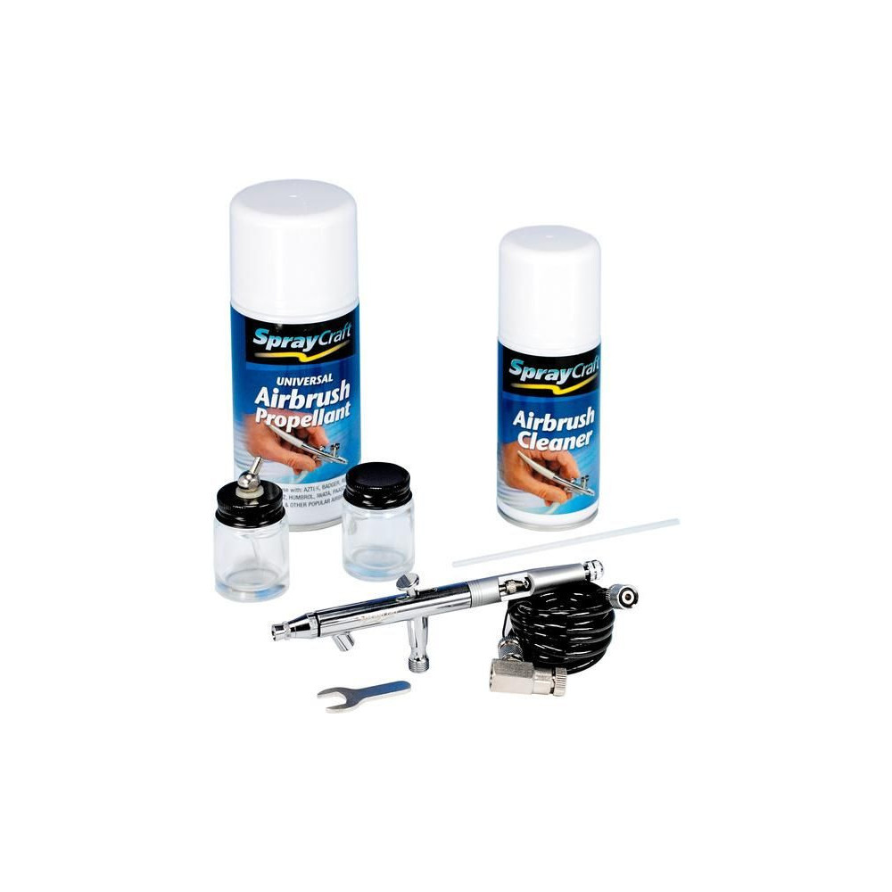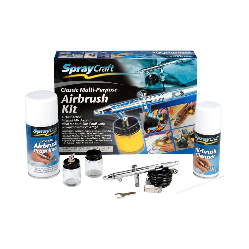 A Spraycraft SP50K Airbrush szórópisztoly készlet egy komplett készlet, amely tartalmazza a pisztolyt, a csatlakozótömlőt, a nyomástartó edényt szerelvénnyel, a tisztítóspray-t, az üvegfestéktartályt a pisztolyhoz, a tartalék tégelyt és a szerelőkulcsot. Ideális kisebb tárgyakhoz, készletekhez stb.
