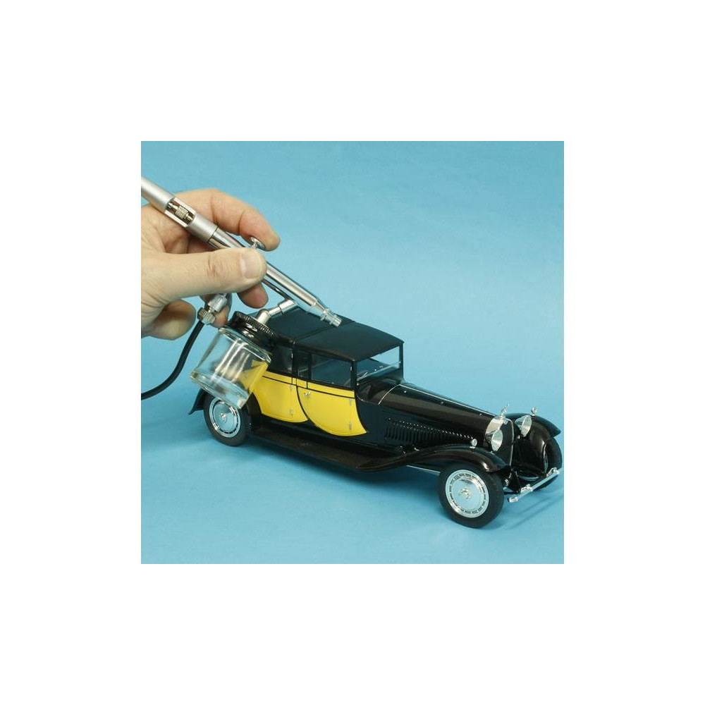 A kettős működésű pisztoly külön levegő- és külön festékadagolással rendelkezik. A ravaszt meghúzva levegőt adagol, a hátrahúzás kinyitja a fúvókát, a hátrahúzás pedig a tűt húzza a festékmennyiség adagolásához.