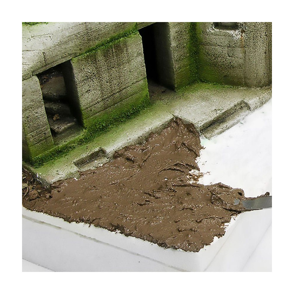 Tmavá zemina je ideálny produkt na vytvorenie sýtych tmavých odtieňov zeme na podkladoch diorám alebo vinetách, kde je požadovaná hustá a silná štruktúra.