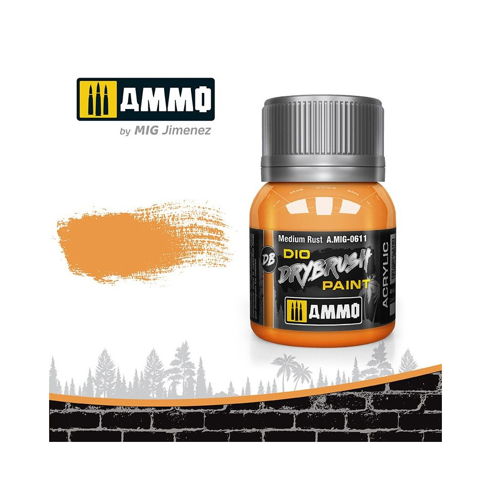 Spoločnosť AMMO navrhla novú receptúru farby špeciálne na drybrushing s ideálnou hustotou a špecifickými vlastnosťami, ktoré z nej robia najlepší typ farby na túto techniku. Nový DIO DRY BRUSH je dokonalým riešením pre všetkých modelárov, ktorí milujú túto ikonickú techniku, pravdepodobne jednu z najjednoduchších a najefektívnejších techník zvetrávania. Stačí použiť štetec ľubovoľnej veľkosti, nabiť ho farbou, vysušiť ju na dotyk pretretím o kúsok papierovej utierky alebo handričky, aby sa odstránil prebytok, a potom ju jemným rozotieraním naniesť na detaily modelu, aby sa vytvorila hladká, rovnomerná štruktúra.