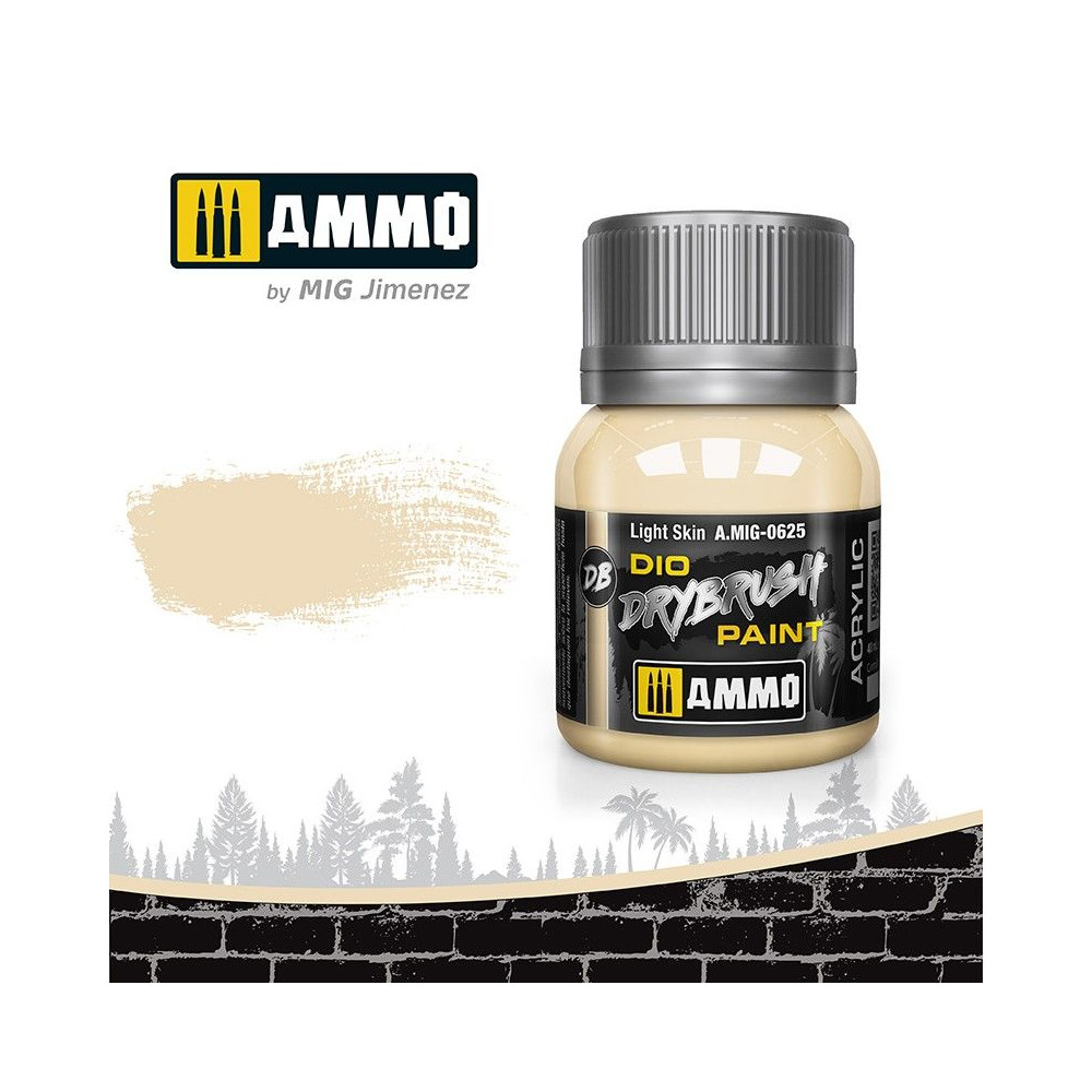 Spoločnosť AMMO navrhla novú receptúru farby špeciálne na drybrushing s ideálnou hustotou a špecifickými vlastnosťami, ktoré z nej robia najlepší typ farby na túto techniku. Nový DIO DRY BRUSH je dokonalým riešením pre všetkých modelárov, ktorí milujú túto ikonickú techniku, pravdepodobne jednu z najjednoduchších a najefektívnejších techník zvetrávania. Stačí použiť štetec ľubovoľnej veľkosti, nabiť ho farbou, vysušiť ju na dotyk pretretím o kúsok papierovej utierky alebo handričky, aby sa odstránil prebytok, a potom ju jemným rozotieraním naniesť na detaily modelu, aby sa vytvorila hladká, rovnomerná štruktúra.