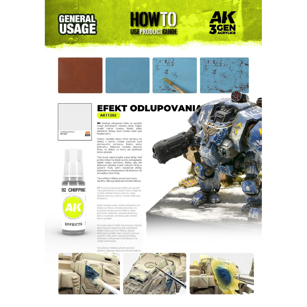 Najprv model natrite tmavou farbou alebo základnou farbou, ktorú chcete vidieť pod škrabancami. Potom naneste vrstvu tohto výrobku na oblasť, s ktorou chcete pracovať, buď jednoducho pomocou štetca, alebo airbrushu. Nakoniec naneste akrylovú farbu na oblasť, kde ste použili tento výrobok. Toto bude najvzdialenejšia vrstva farby. Keď je táto vrstva na dotyk suchá, pokvapkajte oblasť vodou pomocou štetca, aby ste aktivovali výrobok medzi vrstvami farby a vytvorili malé, veľmi realistické efekty poškodenia, odlupovania a škrabancov na najvzdialenejšej vrstve farby. Tieto efekty môžete vytvoriť pomocou ostrého nástroja alebo samotného štetca.