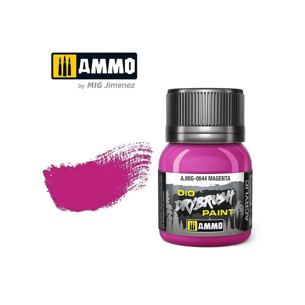 Spoločnosť AMMO navrhla novú receptúru farby špeciálne na drybrushing s ideálnou hustotou a špecifickými vlastnosťami, ktoré z nej robia najlepší typ farby na túto techniku. Nový DIO DRY BRUSH je dokonalým riešením pre všetkých modelárov, ktorí milujú túto ikonickú techniku, pravdepodobne jednu z najjednoduchších a najefektívnejších techník zvetrávania. Stačí použiť štetec ľubovoľnej veľkosti, nabiť ho farbou, vysušiť ju na dotyk pretretím o kúsok papierovej utierky alebo handričky, aby sa odstránil prebytok, a potom ju jemným rozotieraním naniesť na detaily modelu, aby sa vytvorila hladká, rovnomerná štruktúra.