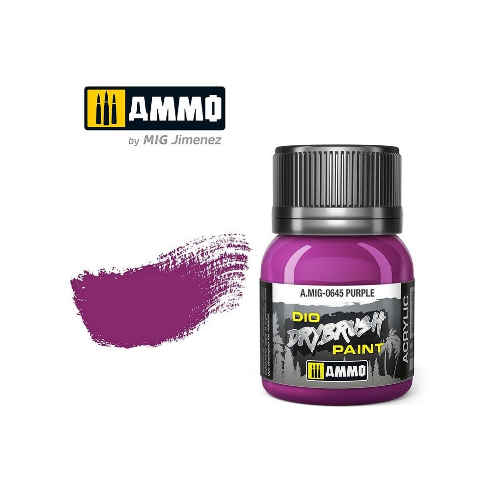 Spoločnosť AMMO navrhla novú receptúru farby špeciálne na drybrushing s ideálnou hustotou a špecifickými vlastnosťami, ktoré z nej robia najlepší typ farby na túto techniku. Nový DIO DRY BRUSH je dokonalým riešením pre všetkých modelárov, ktorí milujú túto ikonickú techniku, pravdepodobne jednu z najjednoduchších a najefektívnejších techník zvetrávania. Stačí použiť štetec ľubovoľnej veľkosti, nabiť ho farbou, vysušiť ju na dotyk pretretím o kúsok papierovej utierky alebo handričky, aby sa odstránil prebytok, a potom ju jemným rozotieraním naniesť na detaily modelu, aby sa vytvorila hladká, rovnomerná štruktúra.