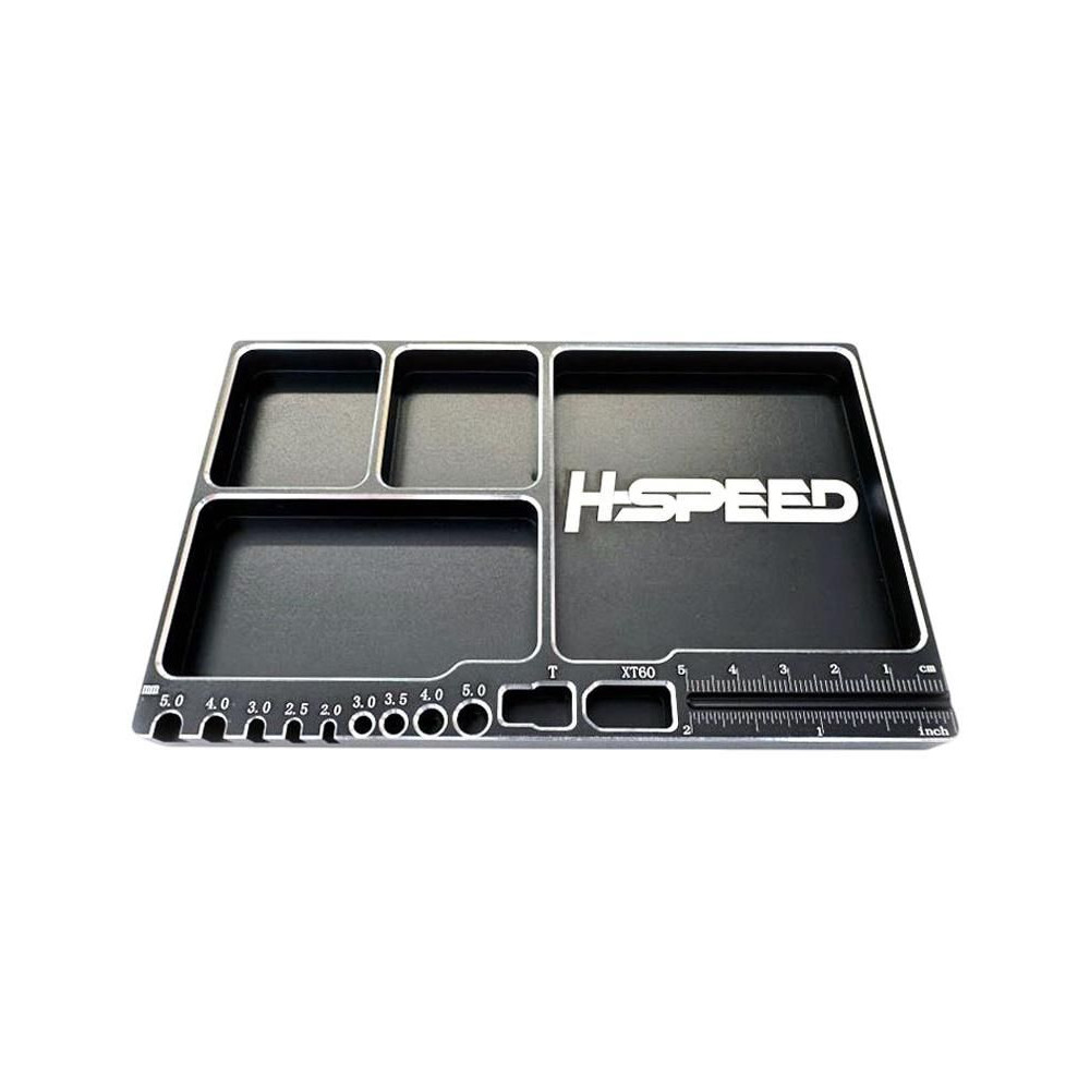 H-Speed alumínium tál kis alkatrészekhez, 16 x 10 cm méretekkel. Ideális eszköz alkatrészek, rögzítőelemek rendszerezéséhez, megakadályozza az alkatrészek elvesztését. 4 különböző méretű rekeszt tartalmaz, 50 mm-es tengelymérővel, Deans és XT60 csatlakozótartókkal (forrasztáshoz alkalmas), 2-5 mm-es furatokkal és félkör alakú kivágásokkal klasszikus csatlakozókhoz, tengelyekhez stb.