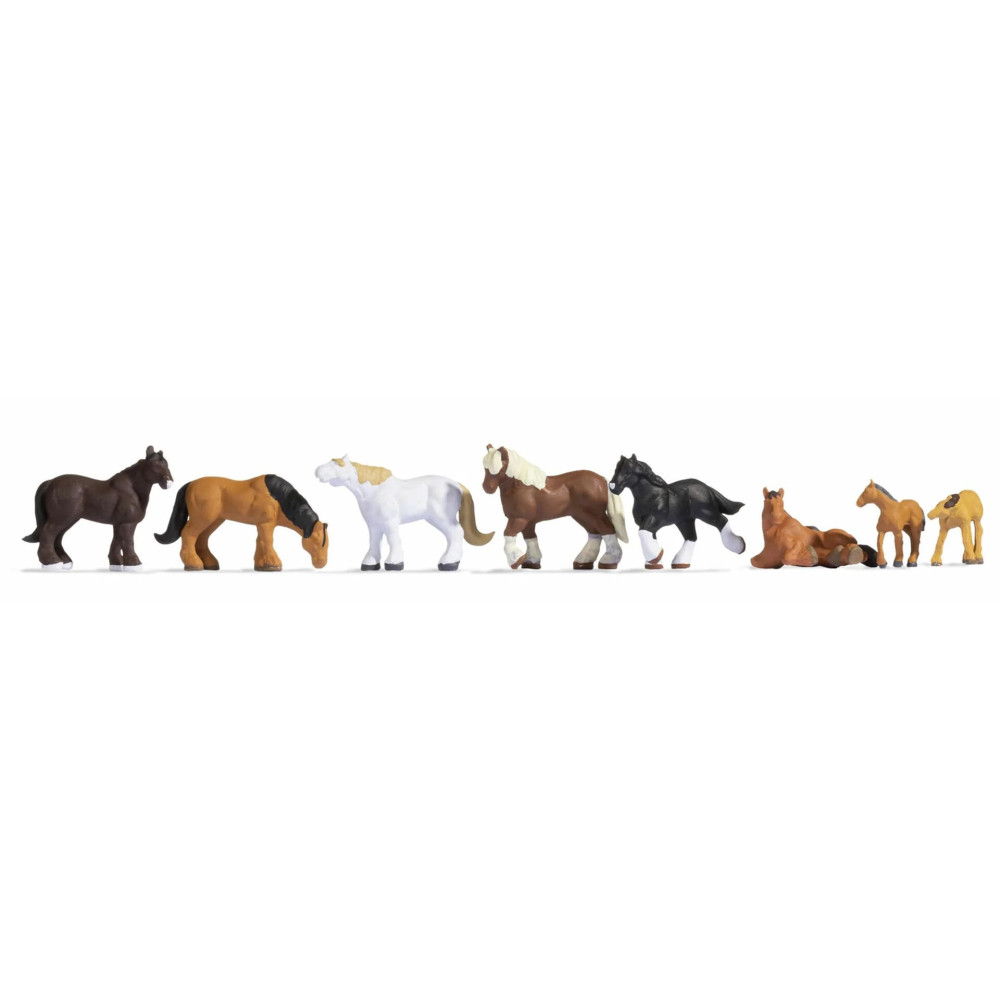 Pomocou "ťažných koní" môžete úspešne zdobiť detailné a realistické vidiecke scény. Súčasťou sady je osem figúrok pre rozchod H0. Dve žriebätká šťastne objavujú svet, zatiaľ čo jeden z dospelých ťažných koní leží v tráve a ostatné sa venujú jedlu alebo si užívajú krásny letný deň na pastve.