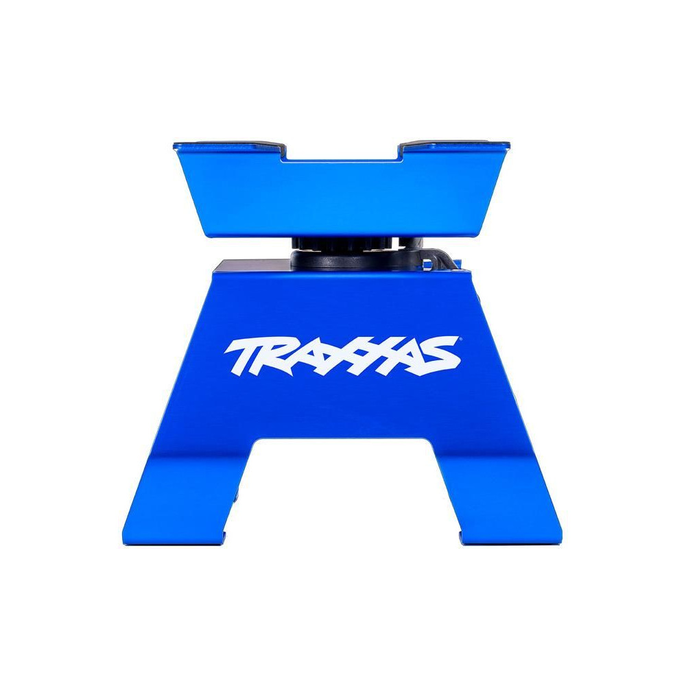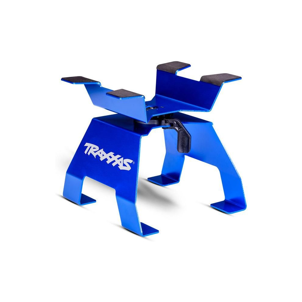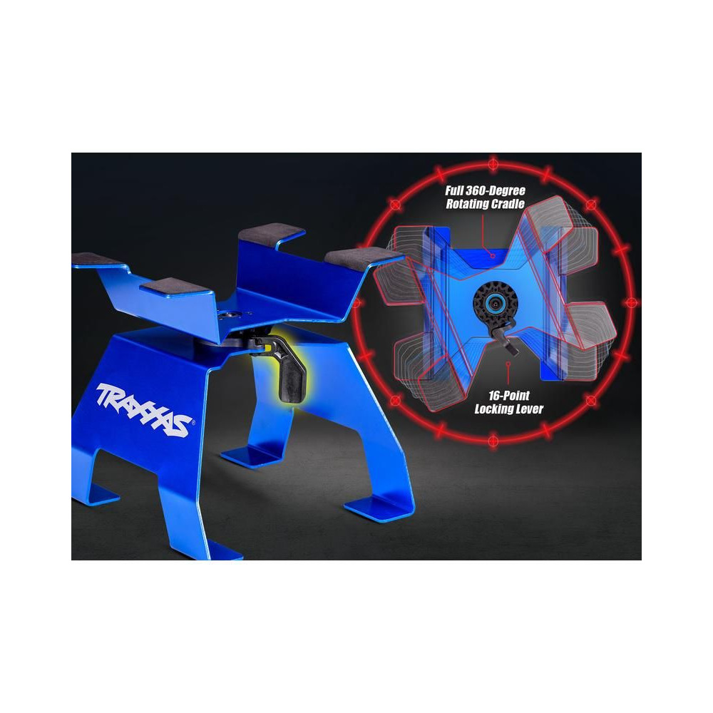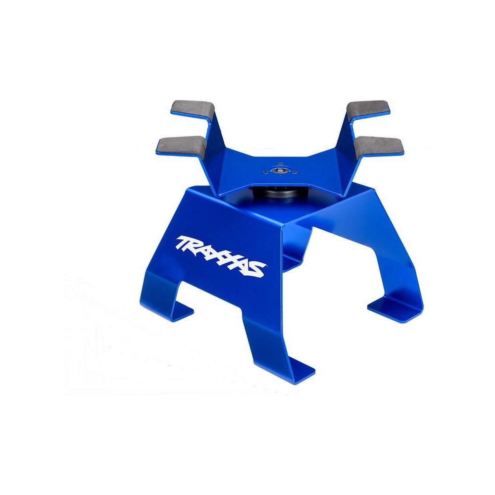 Traxxas állvány kiváló minőségű eloxált alumíniumból készült. Alkalmas 1:5 méretarányú modellautókhoz (X-Maxx, XRT). Az állvány két golyóscsapágyon 360°-ban forgatható, tartalmaz egy kart a forgatás 16 pozíció egyikében történő rögzítéséhez.