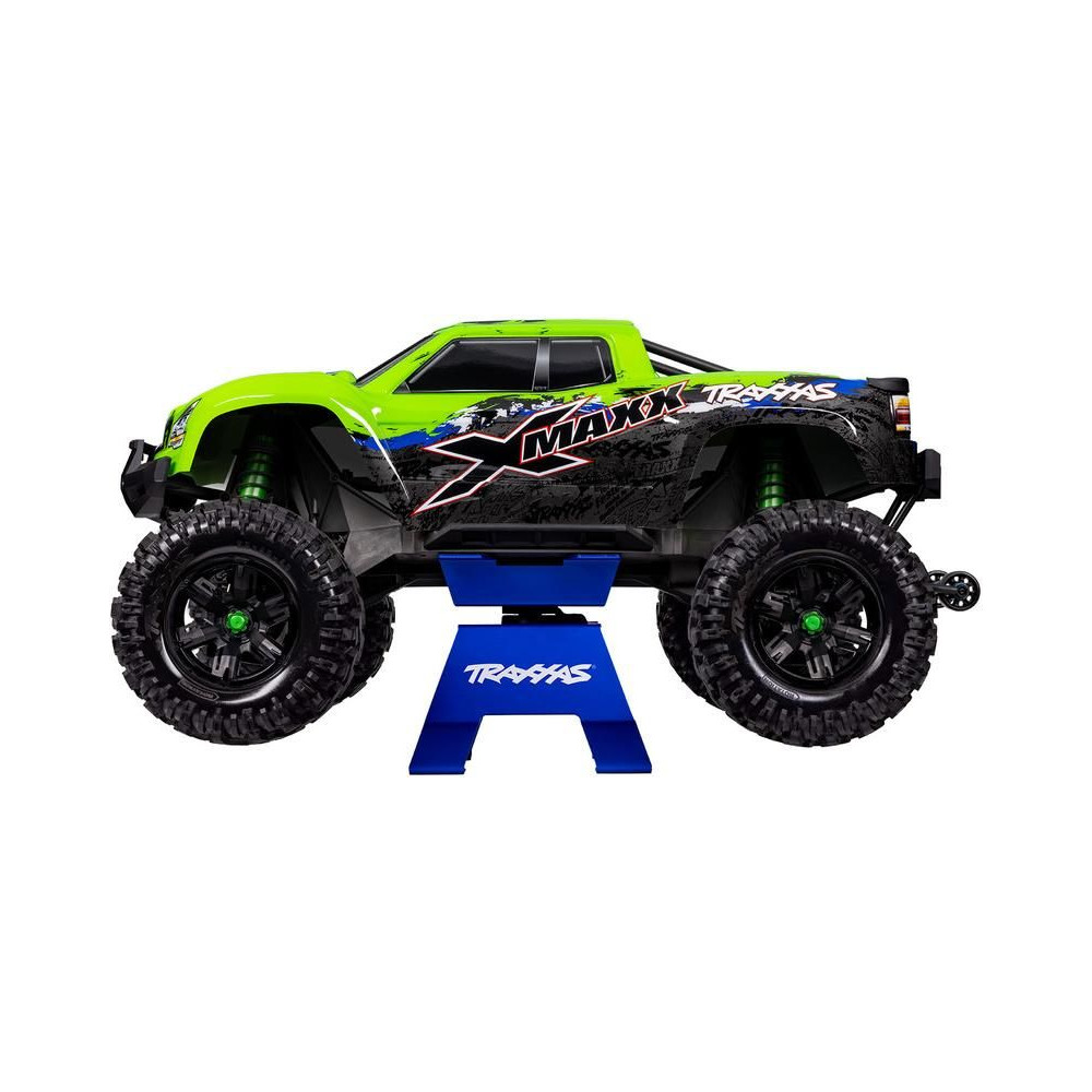 Traxxas állvány kiváló minőségű eloxált alumíniumból készült. Alkalmas 1:5 méretarányú modellautókhoz (X-Maxx, XRT). Az állvány tökéletes kiegészítője a szervizasztalnak vagy a bemutató polcnak. A két golyóscsapággyal és 16 reteszelési pozícióval rendelkező karral ellátott reteszelő forgómechanizmusnak köszönhetően modellje könnyen hozzáférhető és ugyanakkor stabil is lesz. Az érintkezési felületeken habszivacs párnák vannak elhelyezve, hogy megakadályozzák a modell elcsúszását. Az RC-modell állványon való megjelenítése azt is megakadályozza, hogy a gumiabroncsok deformálódjanak (ellaposodjanak) a hosszú ideig tartó állás során.