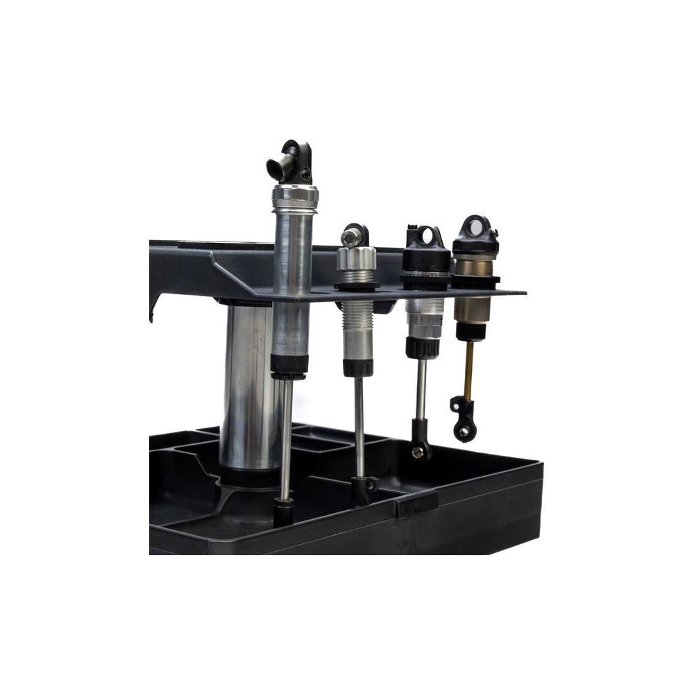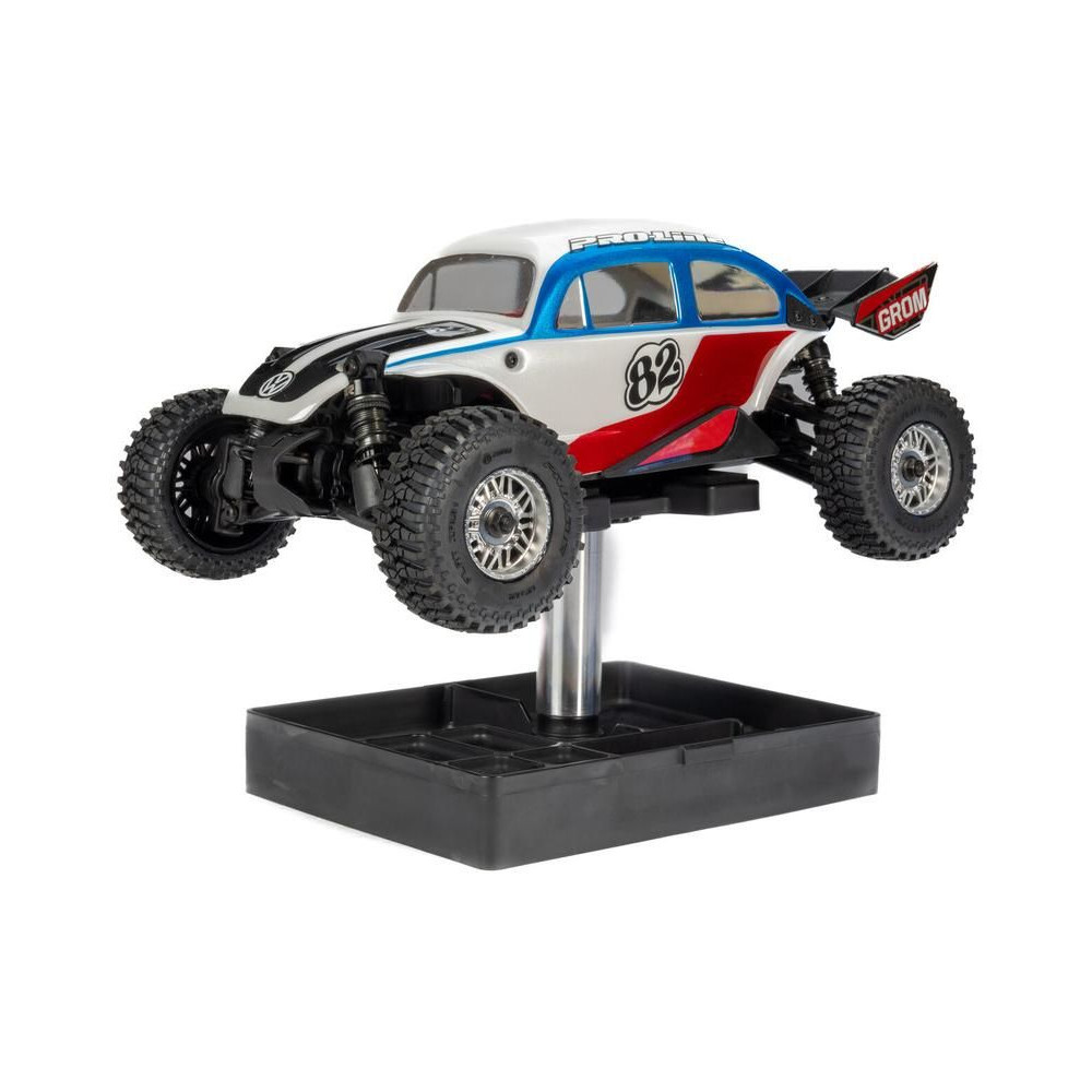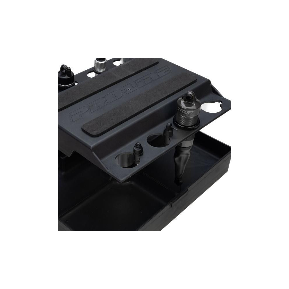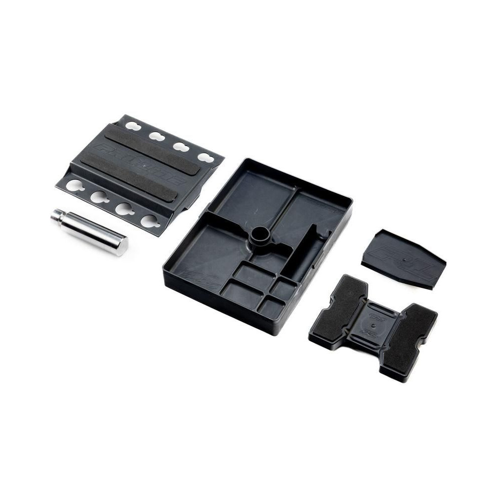 A Pro-Line állvány univerzálisan használható, így kényelmesen szervizelhető az 1:28-as és 1:8-as méretarányú RC autómodellek széles választékához. Simán forgatható, háromrészes moduláris tetővel, beépített tárolóhellyel és kompakt szállítással rendelkezik, könnyen szétszerelhető versenyzők és hobbivezetők számára egyaránt.