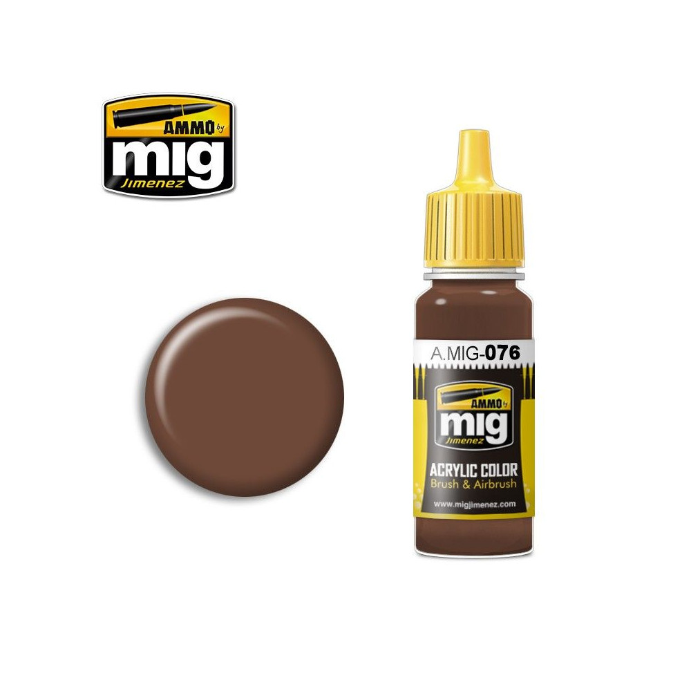 Hnedá farba pôdy. Jedným z jej mnohých použití je aplikácia na britské vozidlá z prvej svetovej vojny. Akrylová - autentická farba s optimalizovaným zložením pre maximálny výkon buď štetcom, alebo airbrushom. 17 ml nádobka. Rozpustná vo vode, bez zápachu a netoxická. Pred každým použitím dobre pretrepte. Každá nádobka obsahuje miešadlo z nehrdzavejúcej ocele na uľahčenie miešania. Na správne riedenie odporúčame použiť akrylové riedidlo A.MIG-2000. Úplne zaschne do 24 hodín.