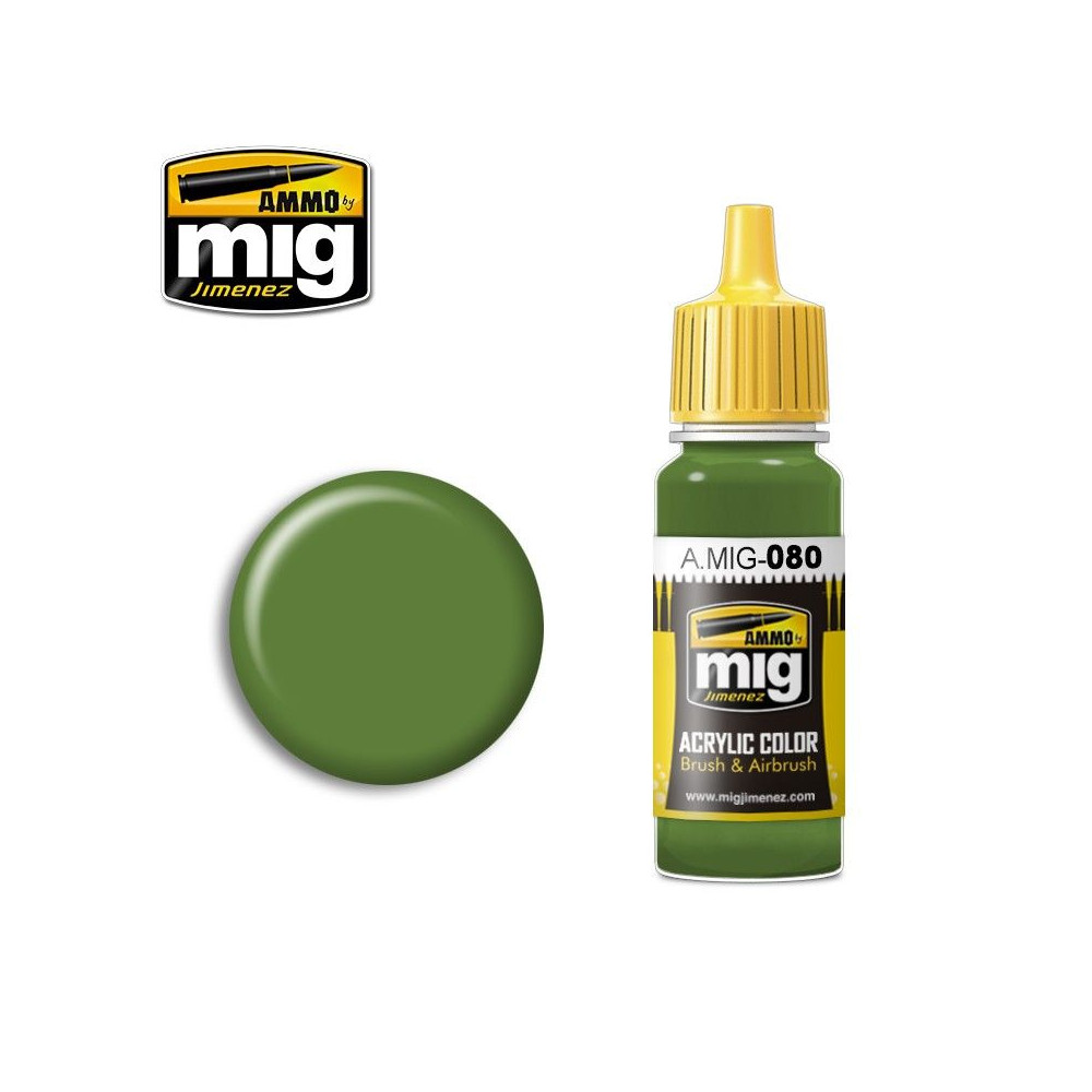 Jasne zelená farba. Používa sa napríklad na prevodovky a iné mechanické časti nemeckých vozidiel, sci-fi vozidiel a mnohých ďalších. Akrylová - autentická farba s optimalizovaným zložením pre maximálny výkon buď štetcom, alebo airbrushom. 17 ml nádobka. Rozpustná vo vode, bez zápachu a netoxická. Pred každým použitím dobre pretrepte. Každá nádobka obsahuje miešadlo z nehrdzavejúcej ocele na uľahčenie miešania. Na správne riedenie odporúčame použiť akrylové riedidlo A.MIG-2000. Úplne zaschne do 24 hodín.