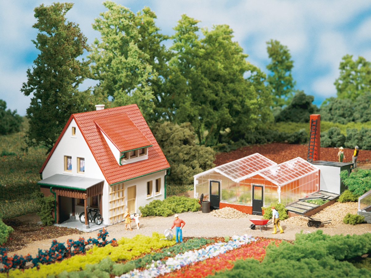 Obytná budova so vstupom do miestnosti na viazanie v zadnej časti. Pripojená kôlňa na náradie, 2 skleníky s interiérom, malý vykurovací domček, studené rámy, náradie a kolieskové korby.